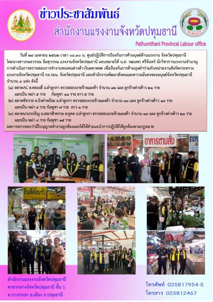 ศูนย์ปฏิบัติการป้องกันการค้ามนุษย์ด้านแรงงานจังหวัดปทุมธานี ดำเนินการตรวจสถานประกอบการกลุ่มเสี่ยงแบบบูรณาการ เพื่อป้องกันการค้ามนุษย์จังหวัดปทุมธานี