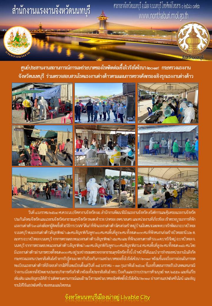 วันที่ 8 มกราคม 2564 ศบค.รง.นบ.(จัดหางานจังหวัด ผอ. สำนักงานพัฒนาฝีมือแรงงานจังหวัด สวัสดิการและคุ้มครองแรงงานจังหวัด ประกันสังคมจังหวัด และแรงงานจังหวัด) สาธารณสุขจังหวัด รพ.สต. ตำรวจ ปกครอง เทศบาลนคร และหน่วยงานที่เกี่ยวข้อง เข้าตรวจบูรณาการที่พักแรงงานต่างด้าว 3 แห่งเพื่อหาผู้ติดเชื้อด้วยวิธีการ SWAP ได้แก่ ที่พักแรงงานต่างด้าวโครงก่อสร้างหมู่บ้านมัณฑนาเวสเกต ต.บางรักพัฒนา อ.บางบัวทอง จ.นนทบุรี พบแรงงานต่างด้าวสัญชาติพม่า 82 คน สัญชาติกัมพูชา 16 คน คนพื้นที่สูง 2 คน ทั้งหมด 100 คน ที่พักคนงานก่อสร้างบัวทองธานี ม.2 ต.ละหาร อ.บางบัวทอง จ.นนทบุรี จากการตรวจสอบพบแรงงานต่างด้าว สัญชาติพม่า 54 คน และ ที่พักแรงงานตาางด้าว ม.1 ต.บางรักใหญ่ อ.บางบัวทอง จ.นนทบุรี จากการตรวจสอบพบแรงงานต่างด้าว สัญชาติพม่า 79 คน สัญชาติกัมพูชา 60 คน สัญชาติลาว 5 คน คนพื้นที่สูง 2 คน ทั้งหมด 146 คน โดยมีแรงงานต่างด้าวผ่านการตรวจทั้งหมด 300 คน อยู่ระหว่างรอผลตรวจจากสาธารณสุขจังหวัด ทั้งนี้ เจ้าหน้าที่ได้แนะนำภารกิจของหน่วยงานในสังกัดกระทรวงแรงงาน ประชาสัมพันธ์สร้างการรับรู้ตามมาตรากันป้องกันการแพร่ระบาดของเชื้อไวรัสโคโรนา 2019 พร้อมชี้แจงเรื่องการผ่อนผันการจดทะเบียนแรงงานต่างด้าวที่ลักลอบทำงานให้ขึ้นทะเบียนตั้งแต่วันที่ 15 มกราคม – 13 กุมภาพันธ์ 2564 ชี้แจงขั้นตอนการขอรับเงินทดแทนกรณีว่างงาน เนื่องจากสั่งปิดสถานประกอบกิจการหรือกักตัว พร้อมทั้งประชาสัมพันธ์ พรบ. ป้องกันและปราบปรามการค้ามนุษย์ พ.ศ. 2551 และที่แก้ไขเพิ่มเติม และเชิญชวนให้เข้าร่วมติดตามสถานการณ์และเฝ้าระวังการแพร่ระบาดของโรคติดเชื้อไวรัสโคโรนา 2019 ผ่านทางแอปพลิเคชั่นไลน์ และเชิญชวนให้ใช้แอปพลิเคชั่น หมอชนะและไทยชนะ
