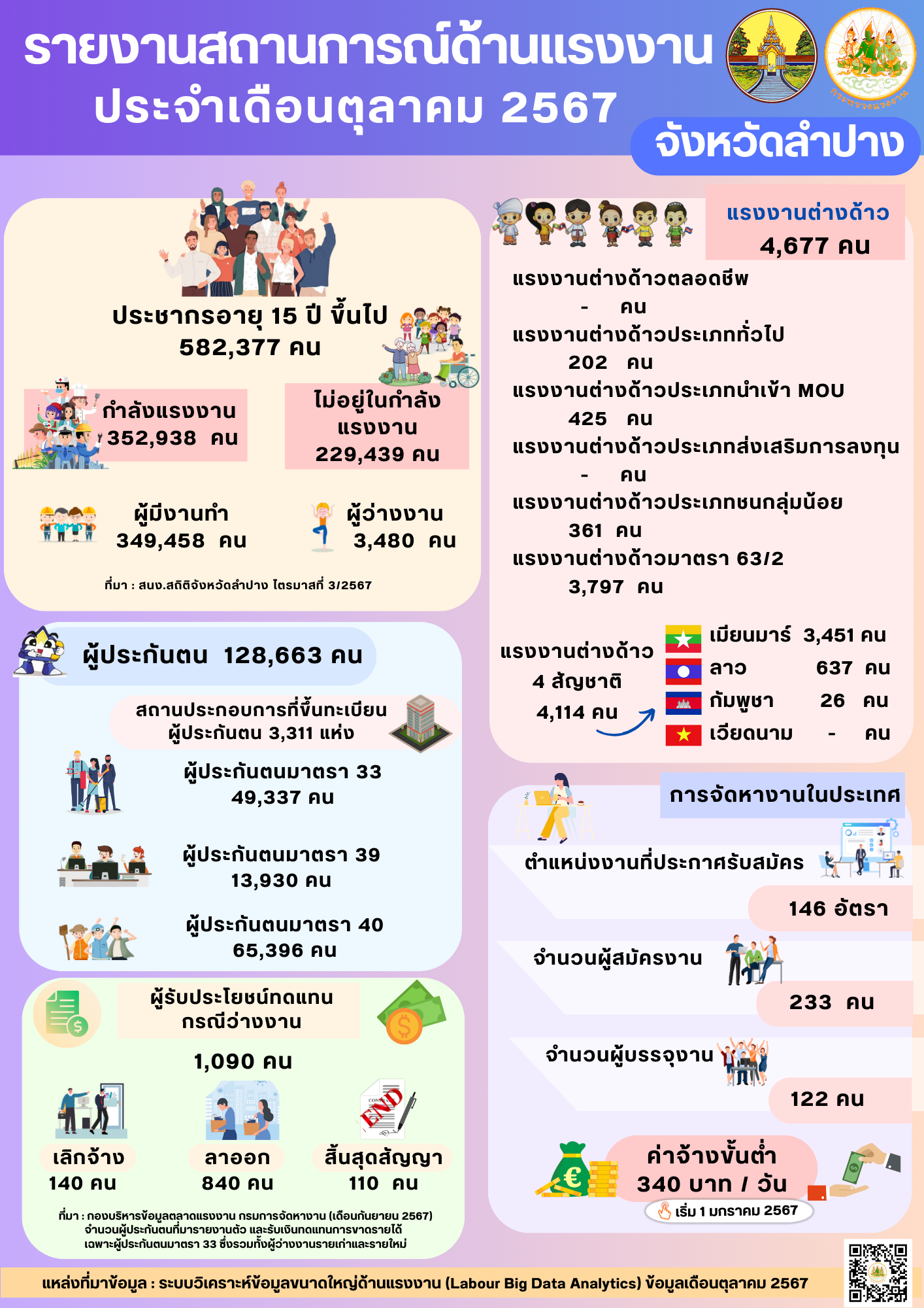 สถานการณ์แรงงานจังหวัดลำปาง “เดือนตุลาคม 2567″ ประมวลผลโดยใช้ระบบวิเคราะห์ข้อมูลขนาดใหญ่ด้านแรงงาน (Labour Big Data Analytics)