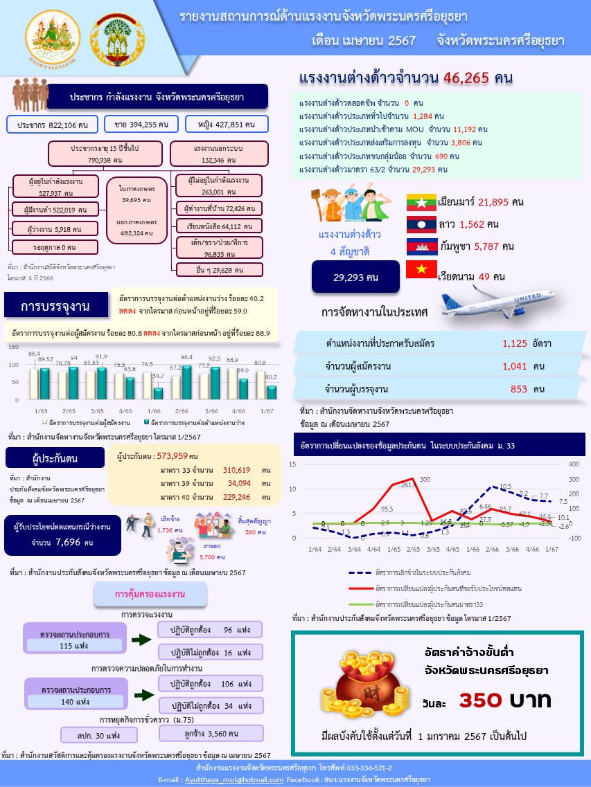 สถานการณ์แรงงานและดัชนีชี้วัดภาวะแรงงานจังหวัดพระนครศรีอยุธยา ประจำเดือนเมษายน 2567