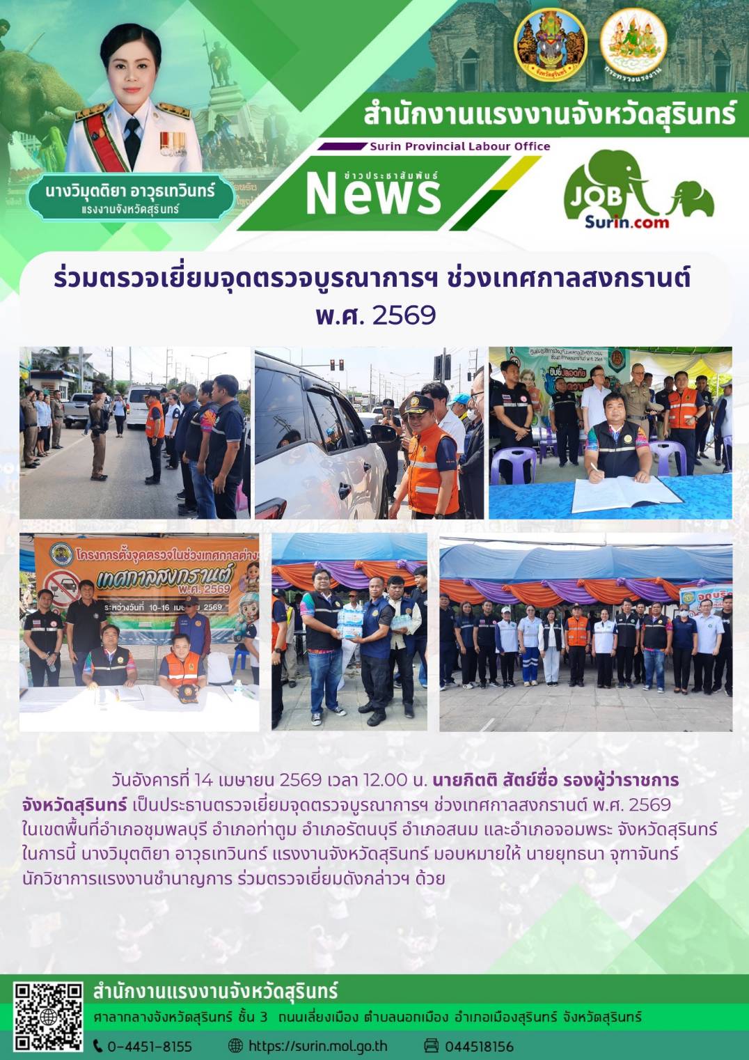 แรงงานจังหวัดสุรินทร์ ร่วมตรวจเยี่ยมจุดตรวจบูรณาการฯ ช่วงเทศกาลสงกรานต์ พ.ศ. 2569