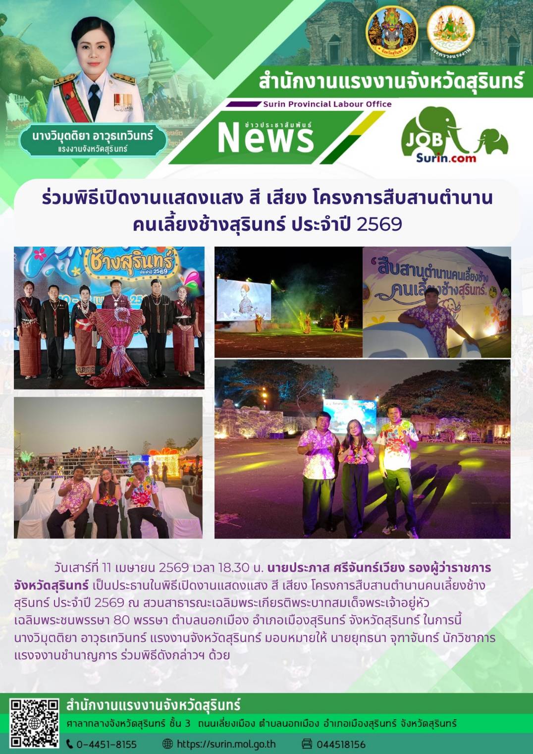 แรงงานจังหวัดสุรินทร์ ร่วมพิธีเปิดงานแสดงแสง สี เสียง โครงการสืบสานตำนาน คนเลี้ยงช้างสุรินทร์ ประจำปี 2569
