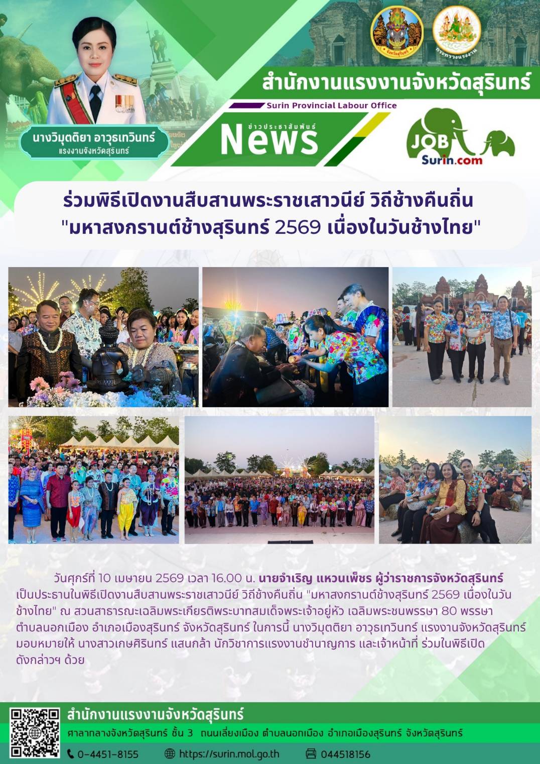 แรงงานจังหวัดสุรินทร์ ร่วมพิธีเปิดงานสืบสานพระราชเสาวนีย์ วิถีช้างคืนถิ่น "มหาสงกรานต์ช้างสุรินทร์ 2569 เนื่องในวันช้างไทย"
