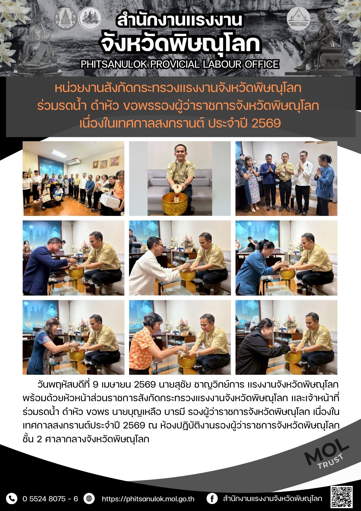 หน่วยงานสังกัดกระทรวงแรงงานจังหวัดพิษณุโลก ร่วมรดน้ำ ดำหัว ขอพรรองผู้ว่าราชการจังหวัดพิษณุโลก เนื่องในเทศกาลสงกรานต์ ประจำปี 2569