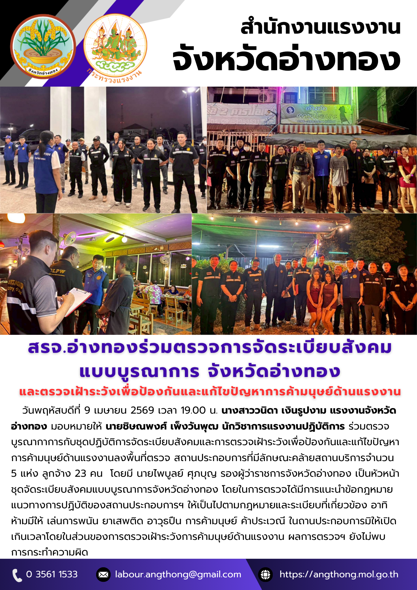 สรจ.อ่างทองร่วมตรวจการจัดระเบียบสังคม แบบบูรณาการ จังหวัดอ่างทอง และตรวจเฝ้าระวังเพื่อป้องกันและแก้ไขปัญหาการค้ามนุษย์ด้านแรงงาน