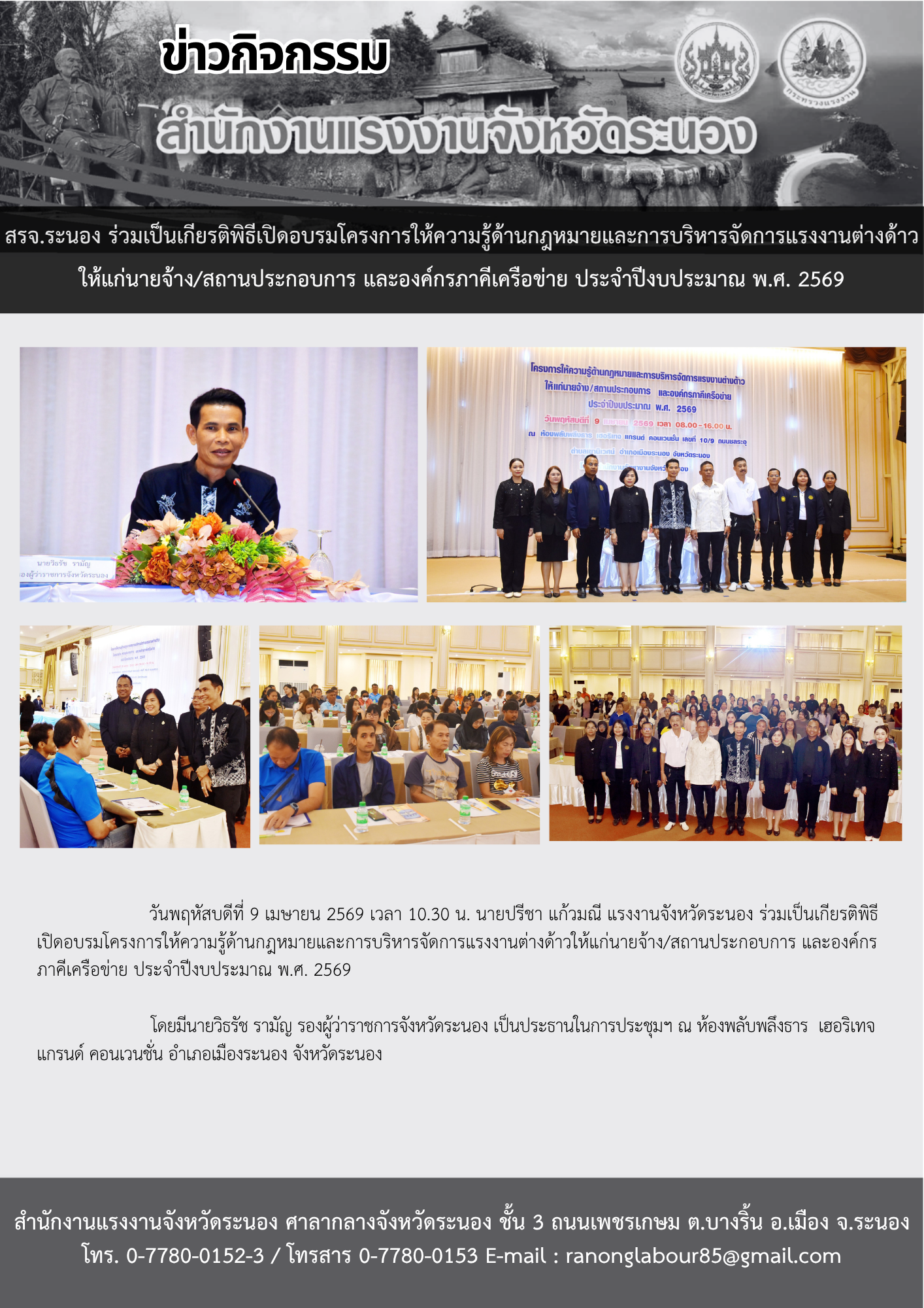 สรจ.ระนอง ร่วมเป็นเกียรติพิธีเปิดอบรมโครงการให้ความรู้ด้านกฎหมายและการบริหารจัดการแรงงานต่างด้าวให้แก่นายจ้าง/สถานประกอบการ และองค์กรภาคีเครือข่าย ประจำปีงบประมาณ พ.ศ. 2569