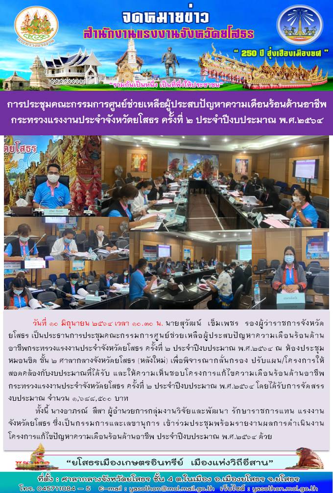 สนง.แรงงานจังหวัดยโสธร ประชุมคณะกรรมการศูนย์ช่วยเหลือผู้ประสบปัญหาความเดือนร้อนด้านอาชีพกระทรวงแรงงานประจำจังหวัดยโสธร ครั้งที่ 2 ประจำปีงบประมาณ พ.ศ.2564