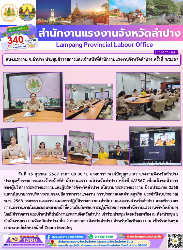 วันที่ 15 ตุลาคม 2567 เวลา 09.00 น. นางสุวรา พงศ์ปัญญาเนตร แรงงานจังหวัดลำปาง ประชุมข้าราชการและเจ้าหน้าที่สำนักงานแรงงานจังหวัดลำปางครั้งที่ 4/2567 เพื่อแจ้งขอสั่งการของผู้บริหารกระทรวงแรงงานและผู้บริหารจังหวัดลำปาง นโยบายกระทรวงแรงงาน ปีงบประมาณ 2568 และนโยบายการบริหารงานของปลัดกระทรวงแรงงาน การประกาศเจตจำนงสุจริต ประจำปีงบประมาณ พ.ศ. 2568 กระทรวงแรงงาน และแนวการปฏิบัติราชการของสำนักงานแรงงานจังหวัดลำปาง