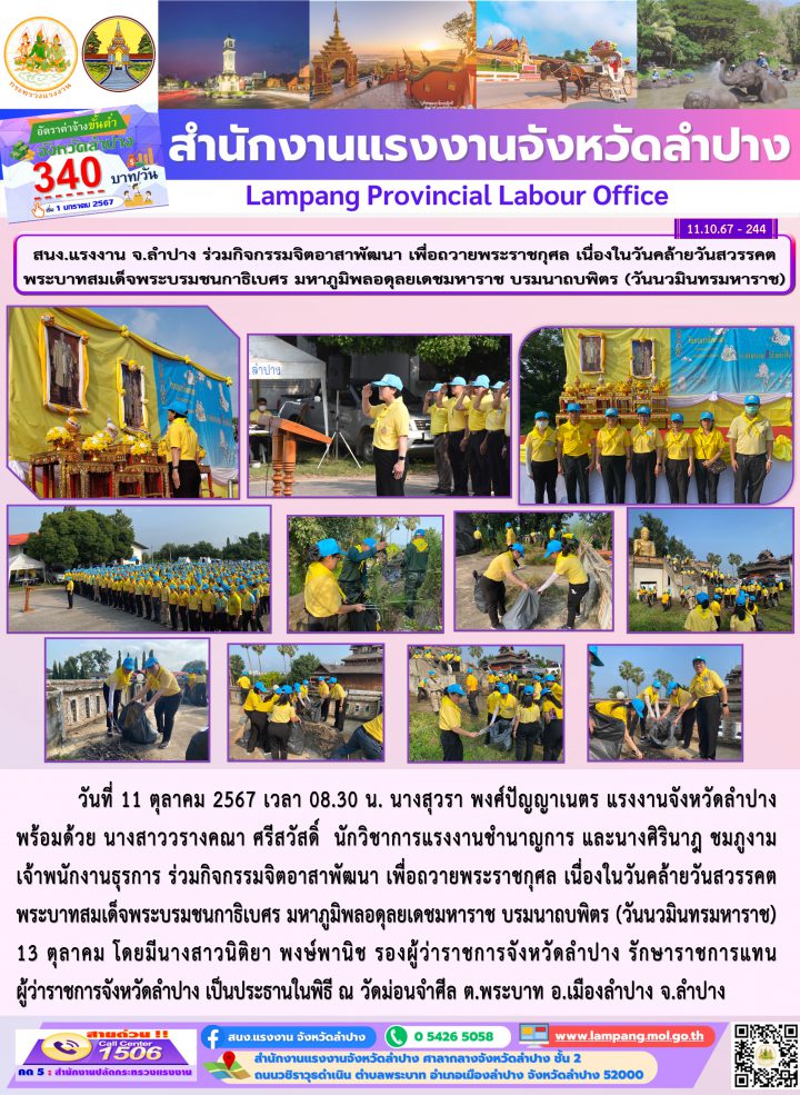 วันที่ 11 ตุลาคม 2567 เวลา 08.30 น. นางสุวรา พงศ์ปัญญาเนตร แรงงานจังหวัดลำปาง พร้อมด้วย นางสาววรางคณา ศรีสวัสดิ์ นักวิชาการแรงงานชำนาญการ และนางศิรินาฎ ชมภูงาม เจ้าพนักงานธุรการ ร่วมกิจกรรมจิตอาสาพัฒนา เพื่อถวายพระราชกุศล เนื่องในวันคล้ายวันสวรรคต พระบาทสมเด็จพระบรมชนกาธิเบศร มหาภูมิพลอดุลยเดชมหาราช บรมนาถบพิตร (วันนวมินทรมหาราช) 13 ตุลาคม โดยมีนางสาวนิติยา พงษ์พานิช รองผู้ว่าราชการจังหวัดลำปาง เป็นประธานในพิธี ณ วัดม่อนจำศีล ตำบลพระบาท อำเภอเมืองลำปาง จังหวัดลำปาง