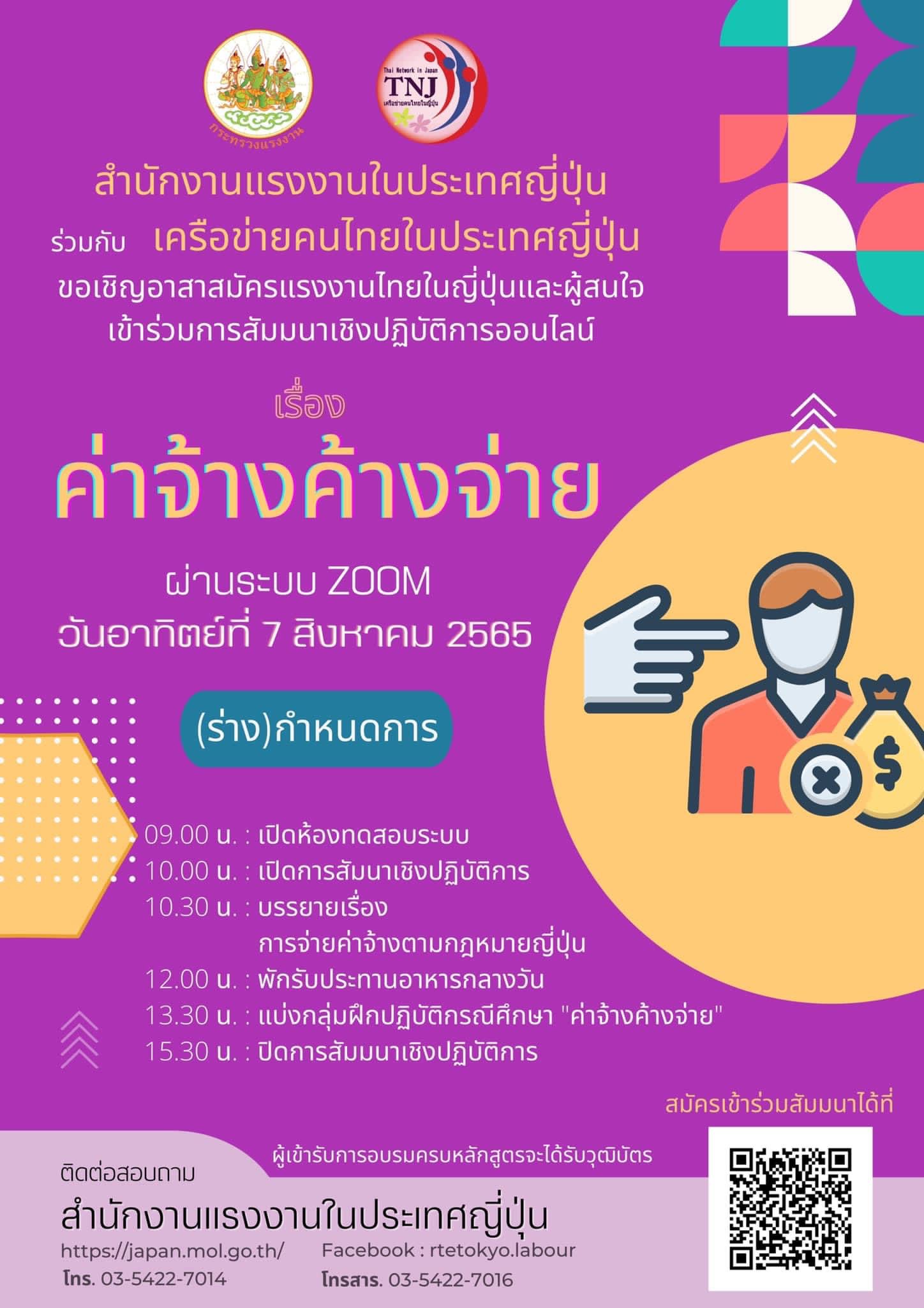 สำนักงานแรงงานในประเทศญี่ปุ่นขอประชาสัมพันธ์การสัมมนาเชิงปฏิบัติการออนไลน์ ในหัวข้อเรื่อง ค่าจ้างค้างจ่าย จัดโดยเครือข่ายคนไทยในญี่ปุ่น (TNJ) และสำนักงานแรงงานในประเทศญี่ปุ่น ในวันอาทิตย์ที่ 7 สิงหาคม 2565