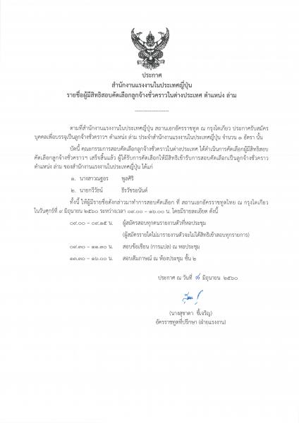 สนร.ญี่ปุ่นประกาศรายชื่อผู้มีสิทธิสอบคัดเลือก ตำแหน่งล่าม