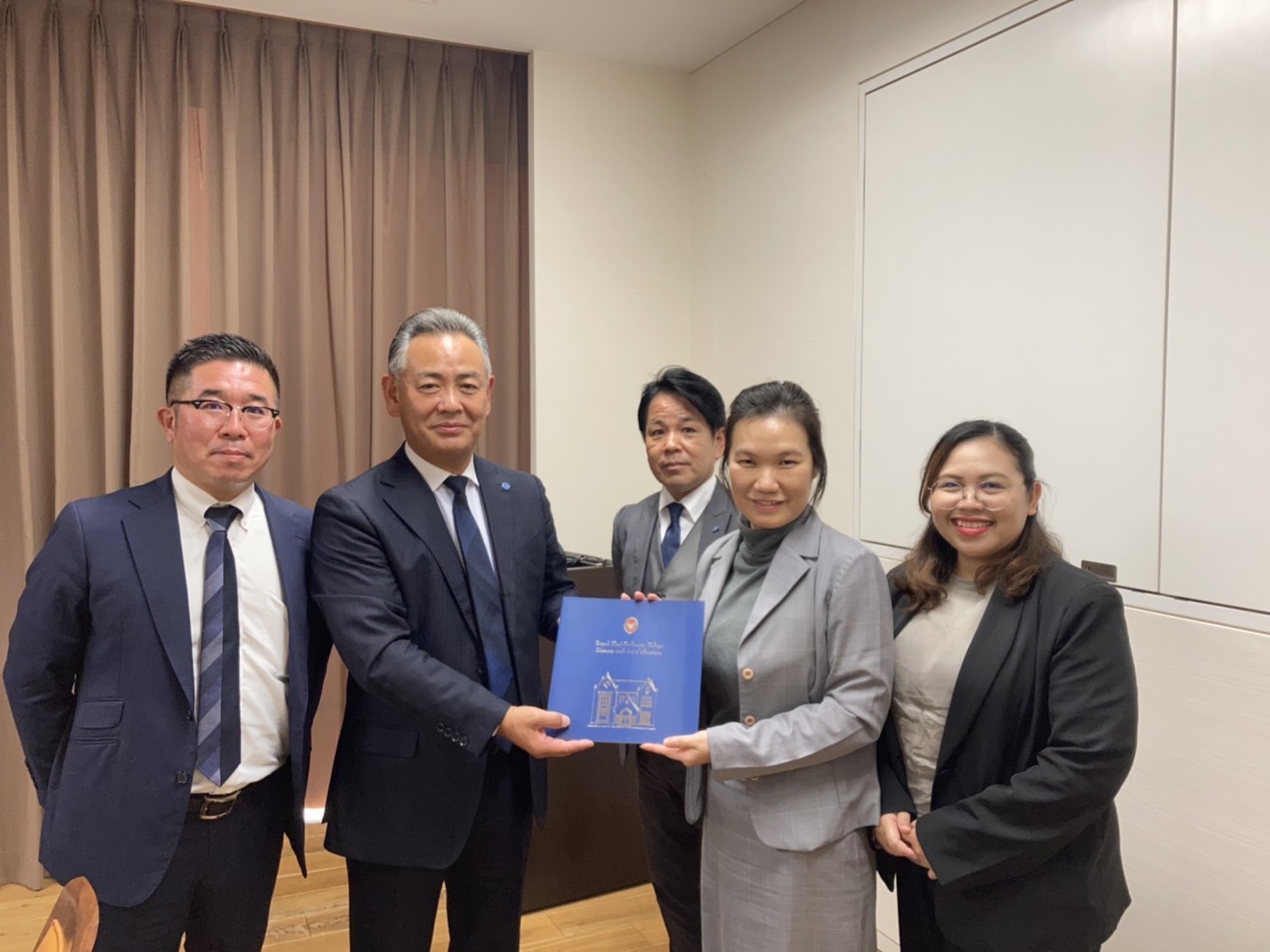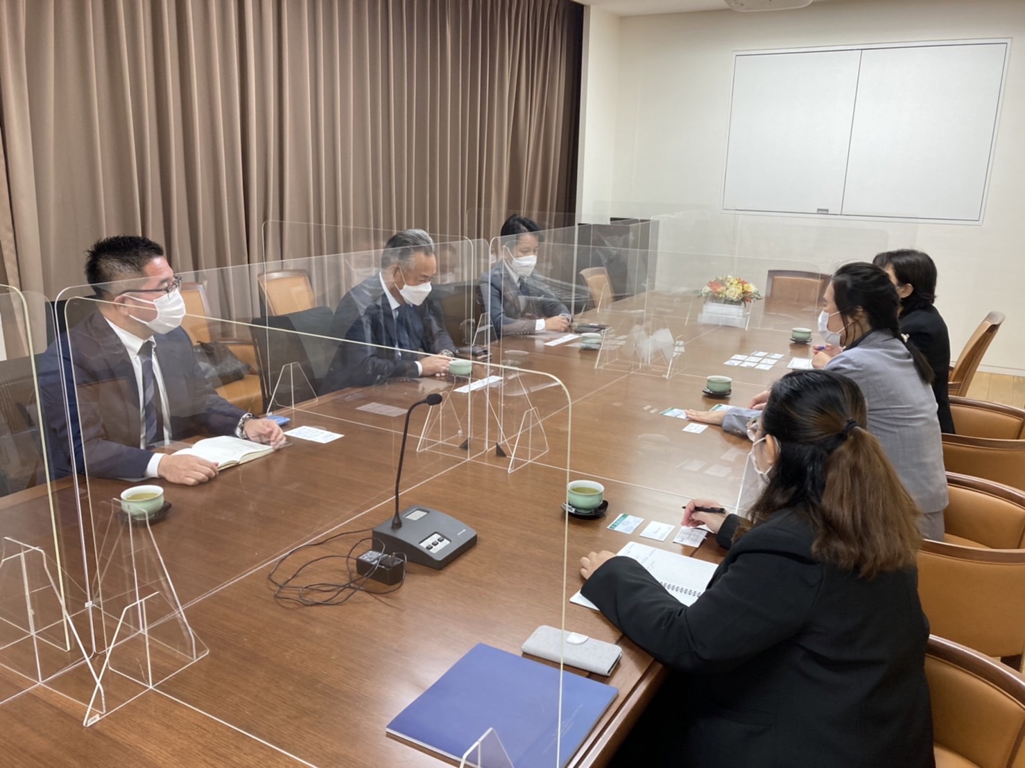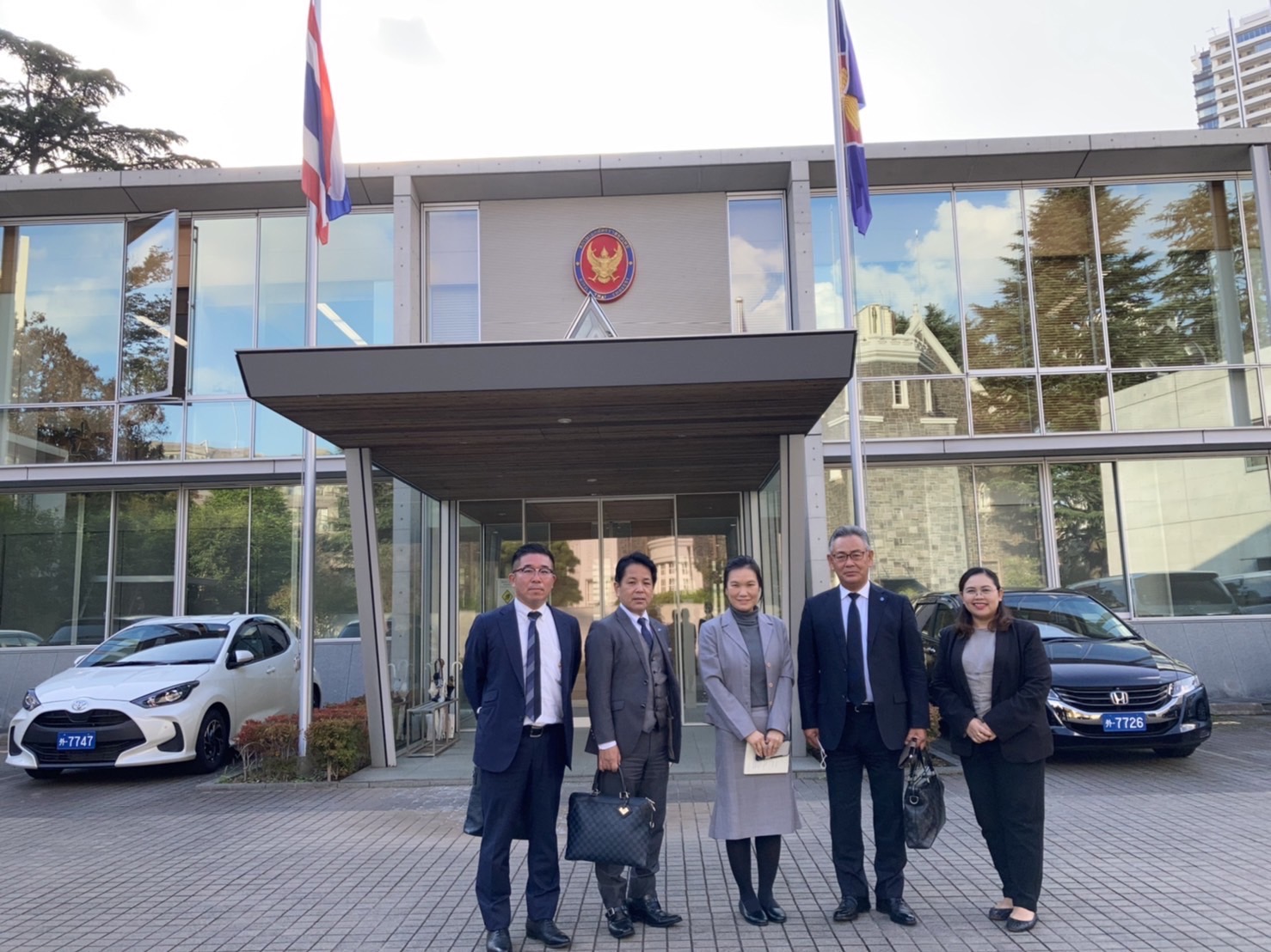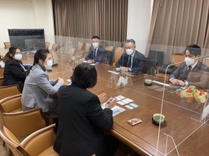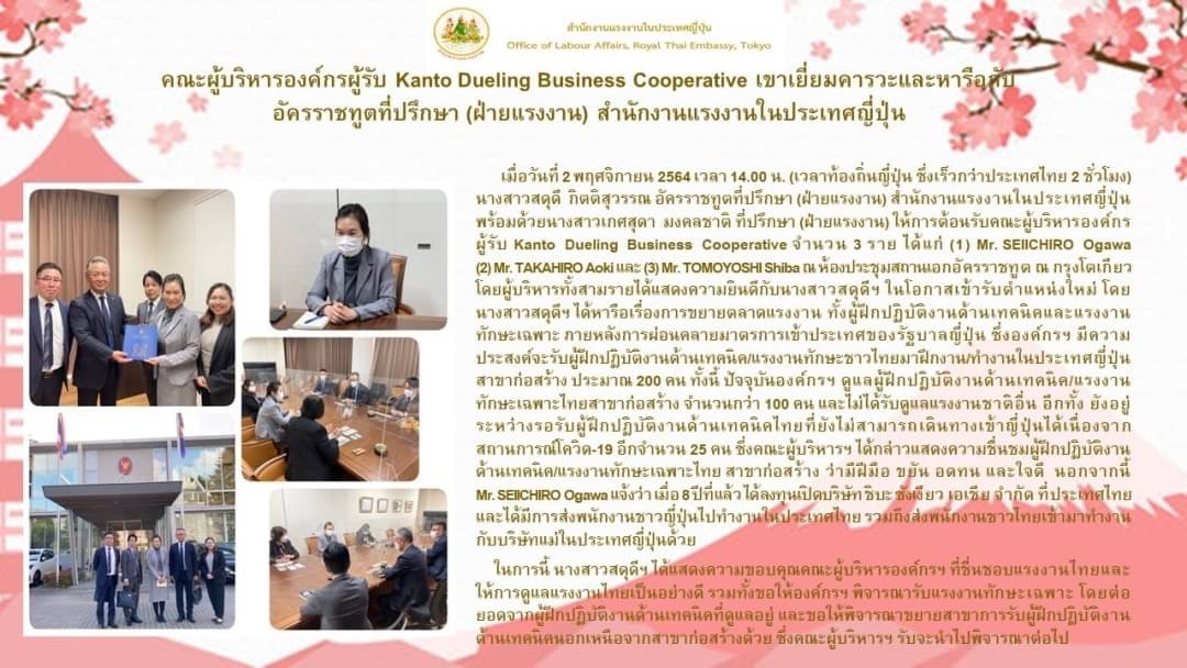 เมื่อวันที่ 2 พฤศจิกายน 2564 เวลา 14.00 น. (เวลาท้องถิ่นญี่ปุ่น ซึ่งเร็วกว่าประเทศไทย 2 ชั่วโมง) นางสาวสดุดี กิตติสุวรรณ อัครราชทูตที่ปรึกษา (ฝ่ายแรงงาน) สำนักงานแรงงานในประเทศญี่ปุ่น พร้อมด้วยนางสาวเกศสุดา มงคลชาติ ที่ปรึกษา (ฝ่ายแรงงาน) ให้การต้อนรับคณะผู้บริหารองค์กรผู้รับ Kanto Dueling Business Cooperative จำนวน 3 ราย ได้แก่ (1) Mr. SEIICHIRO Ogawa (2) Mr. TAKAHIRO Aoki และ (3) Mr. TOMOYOSHI Shiba ณ ห้องประชุมสถานเอกอัครราชทูต ณ กรุงโตเกียว โดยผู้บริหารทั้งสามรายได้แสดงความยินดีกับนางสาวสดุดีฯ ในโอกาสเข้ารับตำแหน่งใหม่ โดยนางสาวสดุดีฯ ได้หารือเรื่องการขยายตลาดแรงงาน ทั้งผู้ฝึกปฏิบัติงานด้านเทคนิคและแรงงานทักษะเฉพาะ ภายหลังการผ่อนคลายมาตรการเข้าประเทศของรัฐบาลญี่ปุ่น ซึ่งองค์กรฯ มีความประสงค์จะรับผู้ฝึกปฏิบัติงานด้านเทคนิค/แรงงานทักษะชาวไทยมาฝึกงาน/ทำงานในประเทศญี่ปุ่น สาขาก่อสร้าง ประมาณ 200 คน ทั้งนี้ ปัจจุบันองค์กรฯ ดูแลผู้ฝึกปฏิบัติงานด้านเทคนิค/แรงงานทักษะเฉพาะไทยสาขาก่อสร้าง จำนวนกว่า 100 คน และไม่ได้รับดูแลแรงงานชาติอื่น อีกทั้ง ยังอยู่ระหว่างรอรับผู้ฝึกปฏิบัติงานด้านเทคนิคไทยที่ยังไม่สามารถเดินทางเข้าญี่ปุ่นได้เนื่องจากสถานการณ์โควิด-19 อีกจำนวน 25 คน ซึ่งคณะผู้บริหารฯ ได้กล่าวแสดงความชื่นชมผู้ฝึกปฏิบัติงานด้านเทคนิค/แรงงานทักษะเฉพาะไทย สาขาก่อสร้าง ว่ามีฝีมือ ขยัน อดทน และใจดี นอกจากนี้ Mr. SEIICHIRO Ogawa แจ้งว่า เมื่อ 8 ปีที่แล้ว ได้ลงทุนเปิดบริษัท ชิบะ ซังเงียว เอเชีย จำกัด ที่ประเทศไทยและได้มีการส่งพนักงานชาวญี่ปุ่นไปทำงานในประเทศไทย รวมถึงส่งพนักงานชาวไทยเข้ามาทำงานกับบริษัทแม่ในประเทศญี่ปุ่นด้วย