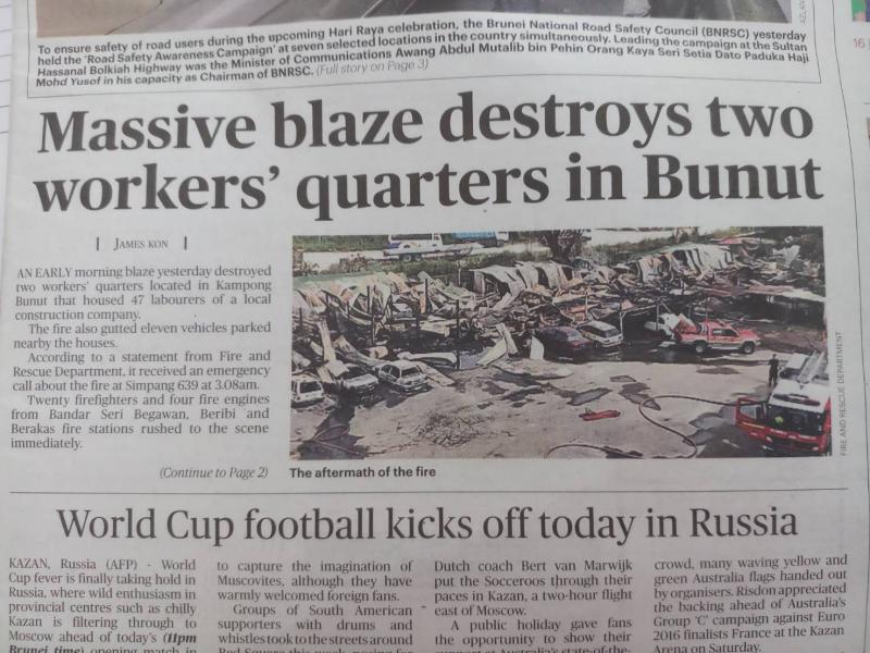 วันที่ 14 มิถุนายน 2561 นางนภวรรณ โกละกะ อัครราชทูตที่ปรึกษา (ฝ่ายแรงงาน) พร้อมด้วยเจ้าหน้าที่สำนักงานแรงงานในประเทศบรูไน ได้ออกตรวจเยี่ยมและให้ความช่วยเหลือแก่แรงงานไทย จำนวน 8 ราย ที่ประสบเหตุเพลิงไหม้ที่พักภายในบริเวณบริษัทของนายจ้างชื่อ SWEE Sdn Bhd ตั้งอยู่ที่ Spg.639 Km.8 Jalan Tutong BF1320 Bandar Seri Begawan ประกอบกิจการรับเหมาก่อสร้าง ซึ่งเพลิงไหม้เกิดขึ้นเมื่อเวลาประมาณ 03.00 น. ของวันที่ 13 มิถุนายน 2561 จากการตรวจเยี่ยมและสอบถามพูดคุยกับแรงงานไทยสันนิษฐานว่าต้นเพลิงเกิดจากบริเวณห้องครัวของบ้านพักคนงานต่างชาติซึ่งอยู่ติดกัน และมีคนงานพักอยู่ในบริเวณดังกล่าวทั้งหมด 47 ราย และไม่มีผู้ใดได้รับบาดเจ็บจากเหตุเพลิงไหม้ดังกล่าว ในเบื้องต้น สนร. บรูไน ได้ประสานพูดคุยกับนายจ้างซึ่งนายจ้างได้ให้ความช่วยเหลือแก่แรงงานเป็นอย่างดี โดยจัดที่พักให้ และมอบค่าใช้จ่ายส่วนหนึ่งแก่แรงงานเพื่อนำไปจัดซื้อของใช้ที่จำเป็น ทั้งนี้ สนร.บรูไน ได้นำข้าวสาร อาหารแห้ง เสื้อผ้าและของใช้อื่นๆ ที่จำเป็นไปมอบให้แก่ผู้ใช้แรงงานไทยทั้ง 8 ราย เรียบร้อยแล้ว และได้ประสานงานกับหน่วยงานอื่นเพื่อให้ความช่วยเหลือเพิ่มเติมต่อไป