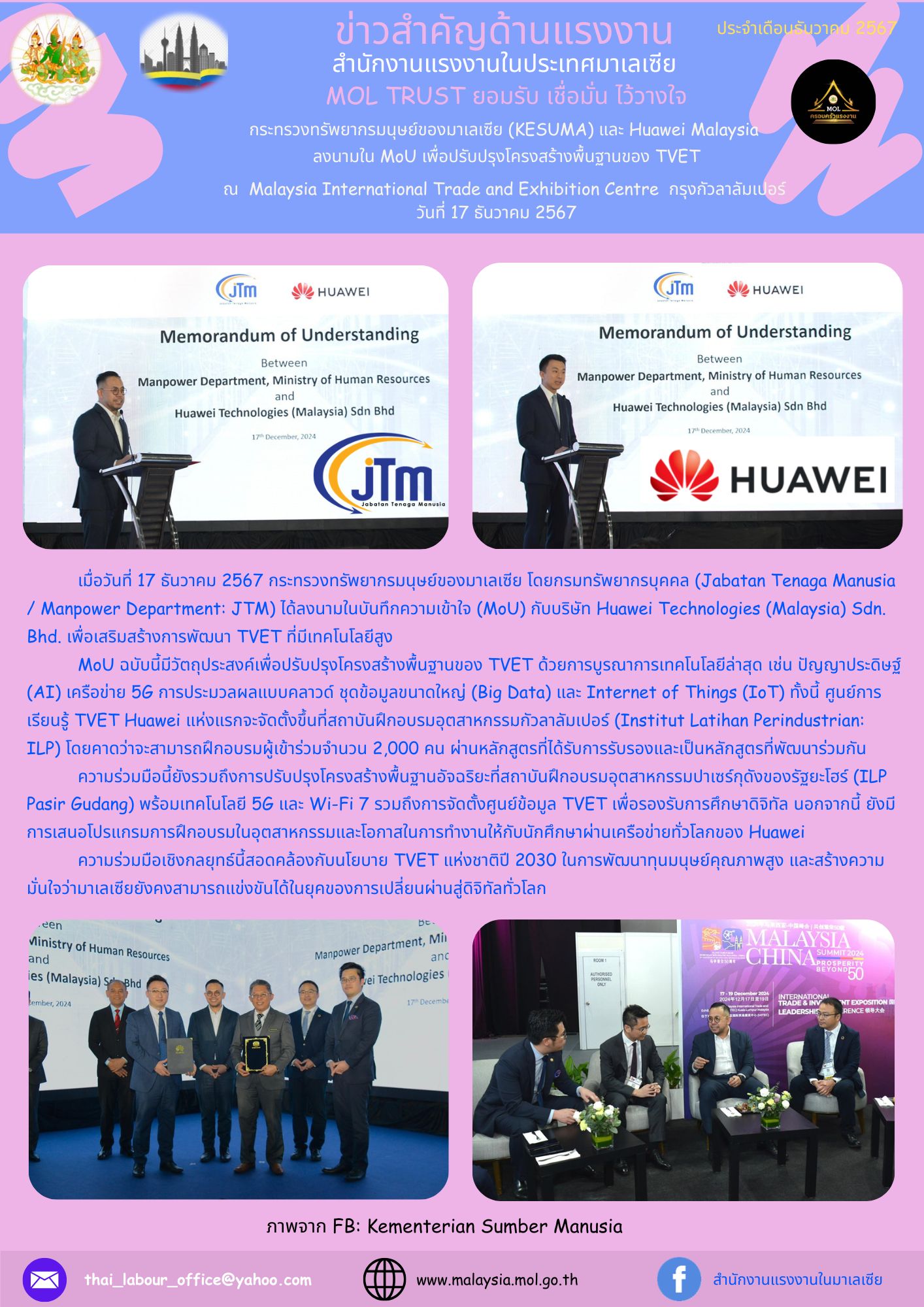สนร.มาเลเซีย กระทรวงทรัพยากรมนุษย์ของมาเลเซีย (KASUMA) และ Huawei Malaysia ลงนามใน MoU เพื่อปรับปรุงโครงสร้างพื้นฐานของ TVET