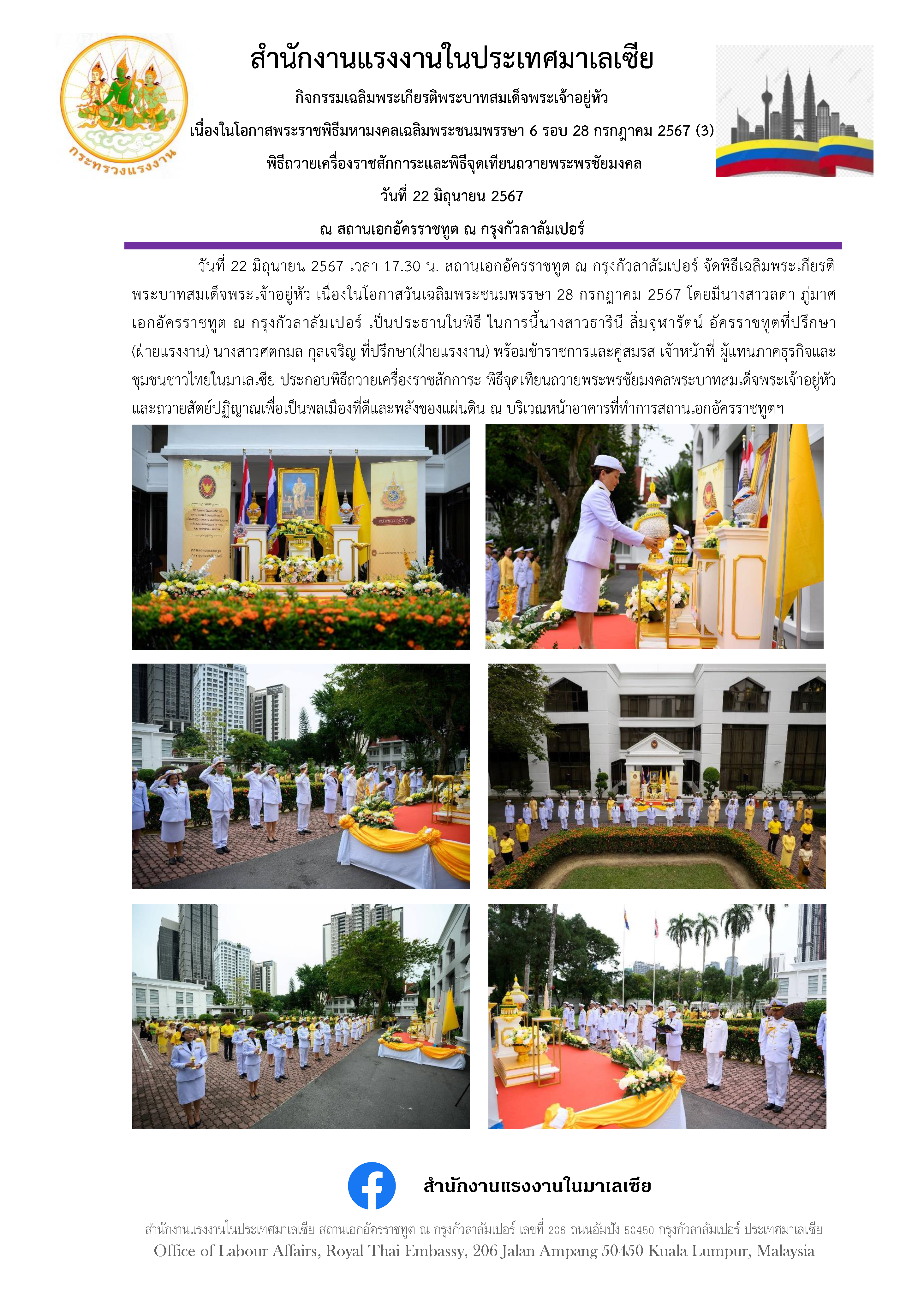 สนร.มาเลเซีย กิจกรรมเฉลิมพระเกียรติพระบาทสมเด็จพระเจ้าอยู่หัว เนื่องในโอกาสพระราชพิธีมหามงคลเฉลิมพระชนมพรรษา 6 รอบ 28 กรกฎาคม 2567 พิธีถวายเครื่องราชสักการะและพิธีจุดเทียนถวายพระพรชัยมงคล วันที่ 22 มิถุนายน 2567