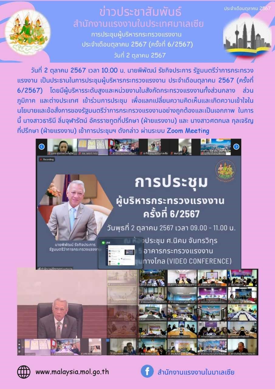 สนร.มาเลเซีย เข้าร่มการประชุมผู้บริหารกระทรวงแรงงานประจำเดือนตุลาคม 2567 (ครั้งที่ 6/2567) วันที่ 2 ตุลาคม 2567