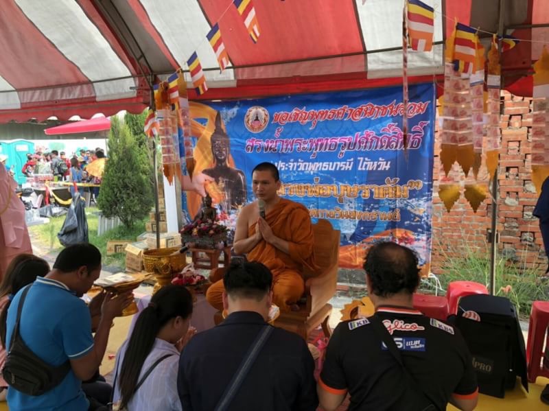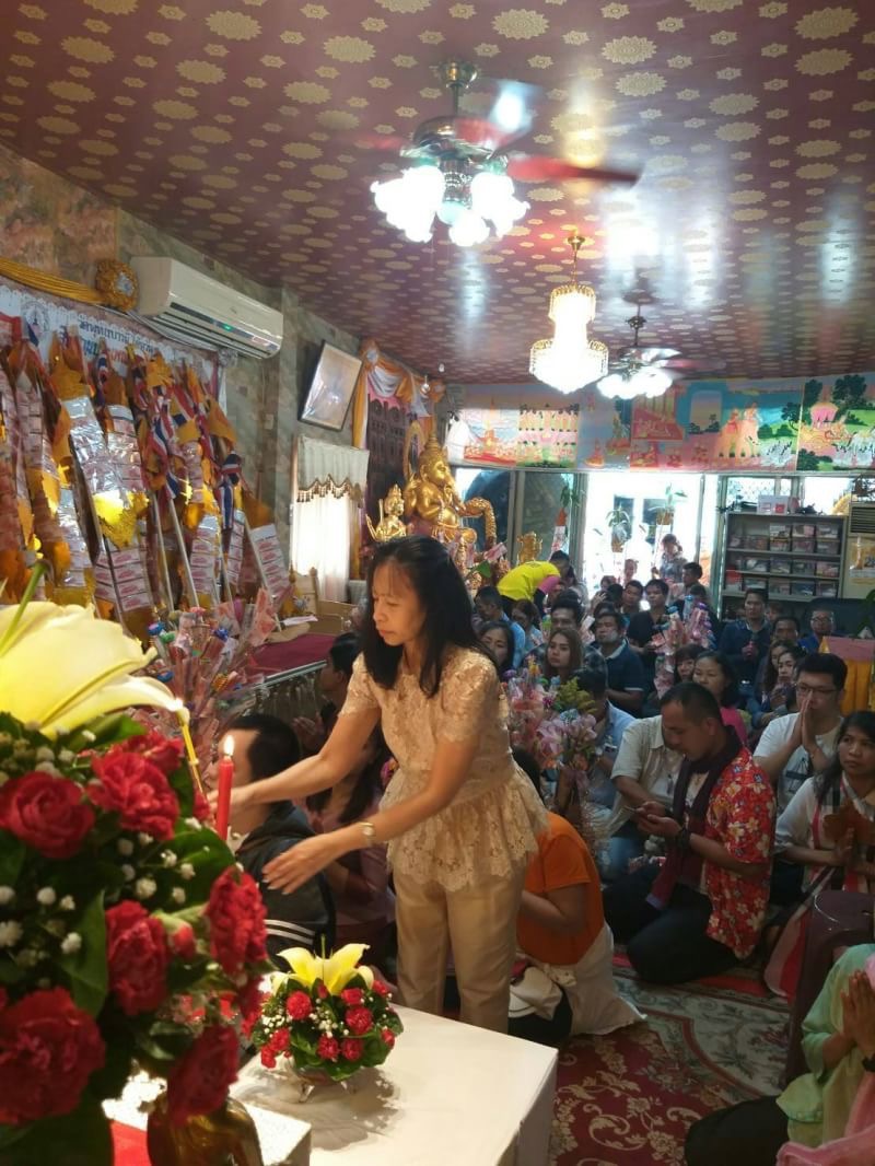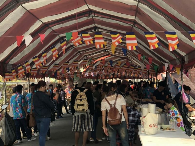 – 11.00 น. พิธีบูชาพระรัตนตรัย สรงน้ำพระ ถวายกองผ้าป่า และรับประทานอาหารที่โรงทานของวัด