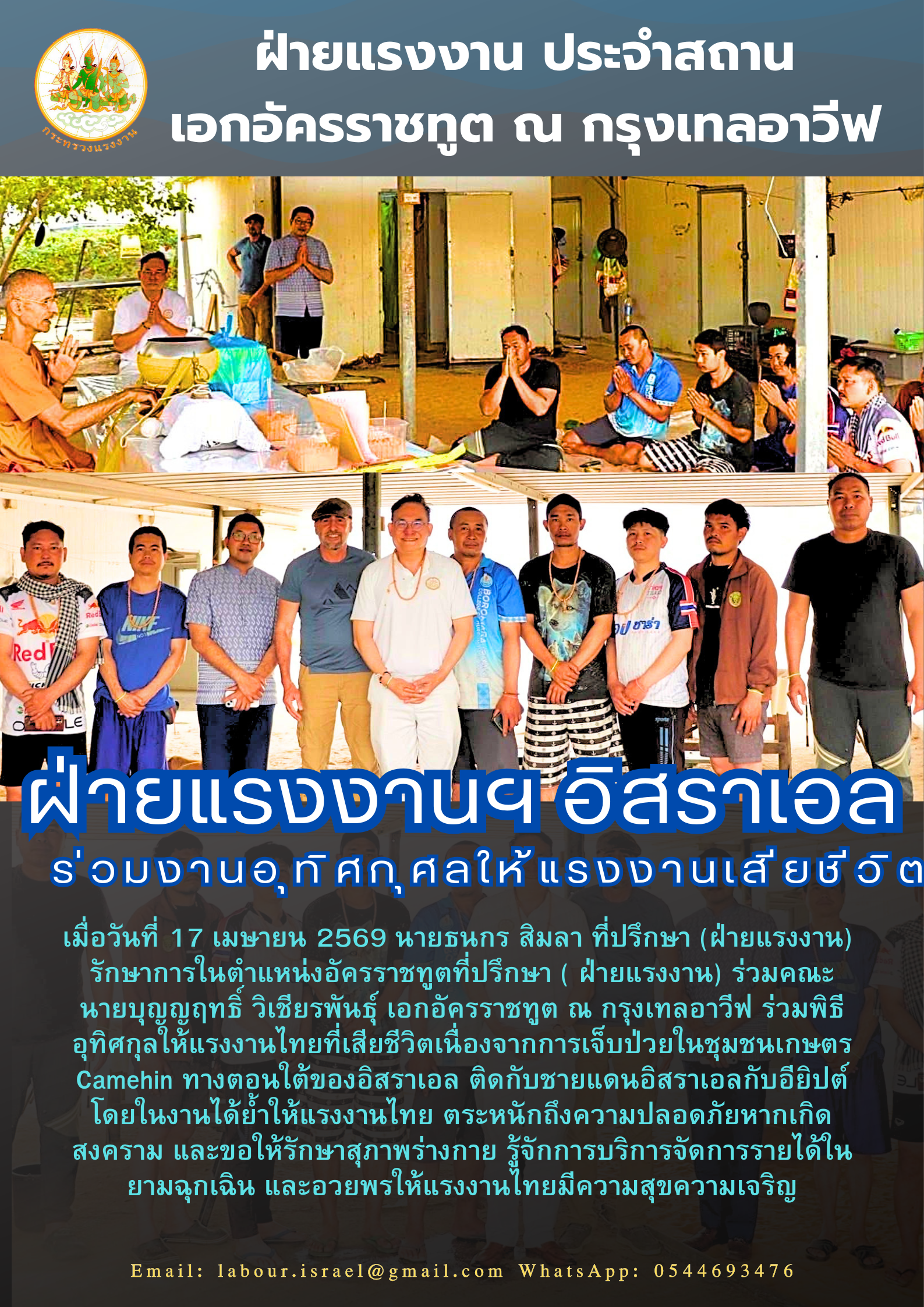 ฝ่ายแรงงาน ประจำสถานเอกอัครราชทูต ณ กรุงเทลอาวีฟ เยี่ยมเยียนแรงงานไทยและร่วมพิธีอุทิศกุศลให้แรงงานไทยที่เสียชีวิต