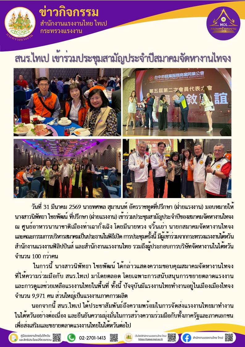 สนร.ไทเป เข้าร่วมประชุมสามัญประจำปีสมาคมจัดหางานไทจง