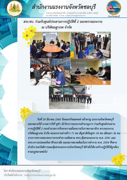 สรง.ชลบุรี ร่วมกับศูนย์ประสานการปฏิบัติที่ 2 ออกตรวจแรงงาน ณ บริษัท ณฐาภพ จำกัด