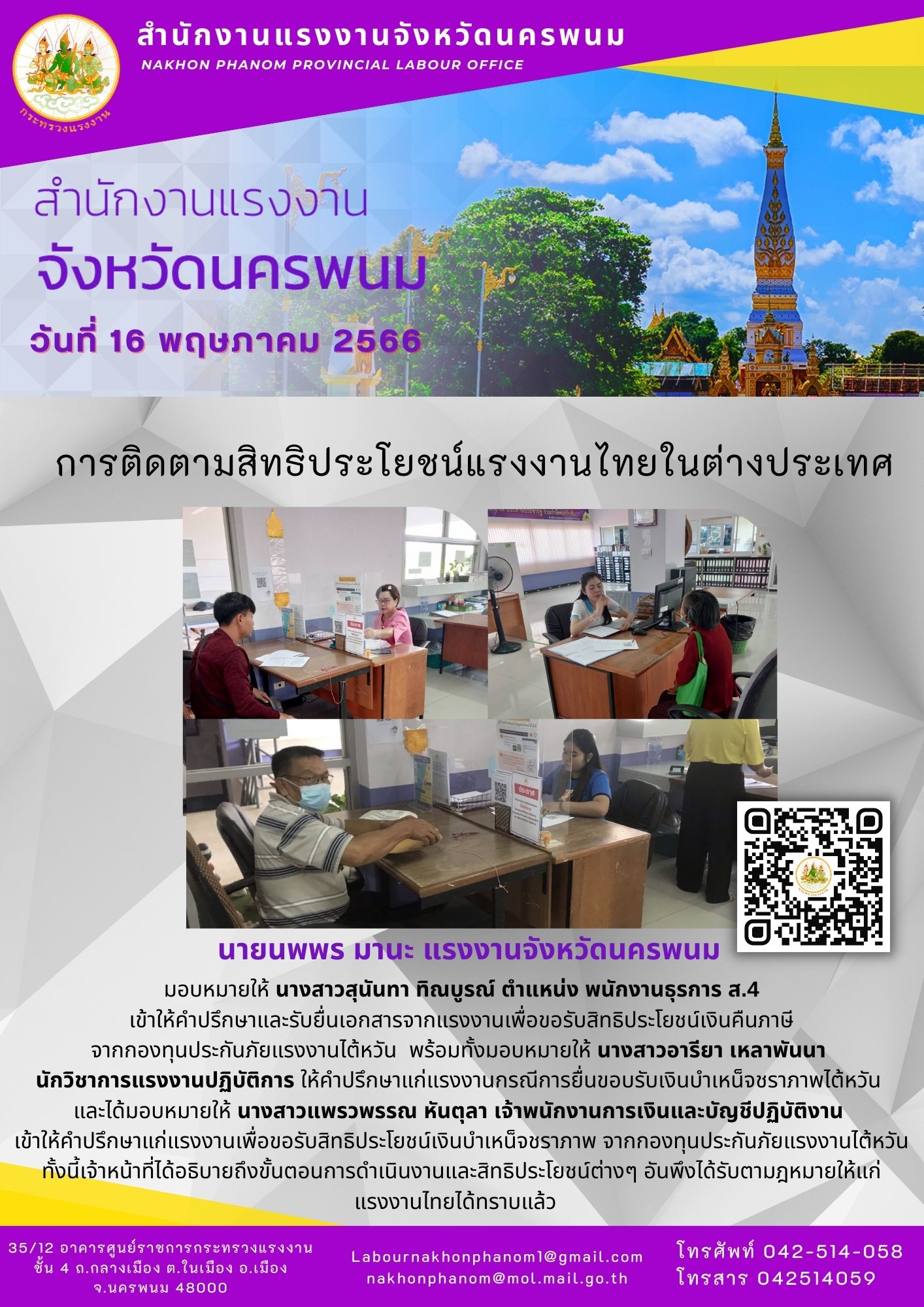 นายนพพร มานะ แรงงานจังหวัดนครพนม มอบหมายให้ นางสาวสุนันทา ทิณบูรณ์ ตำแหน่ง พนักงานธุรการ ส.4เข้าให้คำปรึกษาและรับยื่นเอกสารจากแรงงานเพื่อขอรับสิทธิประโยชน์เงินคืนภาษีจากกองทุนประกันภัยแรงงานไต้หวัน พร้อมทั้งมอบหมายให้ นางสาวอารียา เหลาพันนานักวิชาการแรงงานปฏิบัติการ ให้คำปรึกษาแก่แรงงานกรณีการยื่นขอบรับเงินบำเหน็จชราภาพไต้หวันและได้มอบหมายให้ นางสาวแพรวพรรณ หันตุลา เจ้าพนักงานการเงินและบัญชีปฏิบัติงานเข้าให้คำปรึกษาแก่แรงงานเพื่อขอรับสิทธิประโยชน์เงินบำเหน็จชราภาพ จากกองทุนประกันภัยแรงงานไต้หวันทั้งนี้เจ้าหน้าที่ได้อธิบายถึงขั้นตอนการดำเนินงานและสิทธิประโยชน์ต่างๆ อันพึงได้รับตามฎหมายให้แก่แรงงานไทยได้ทราบแล้ว