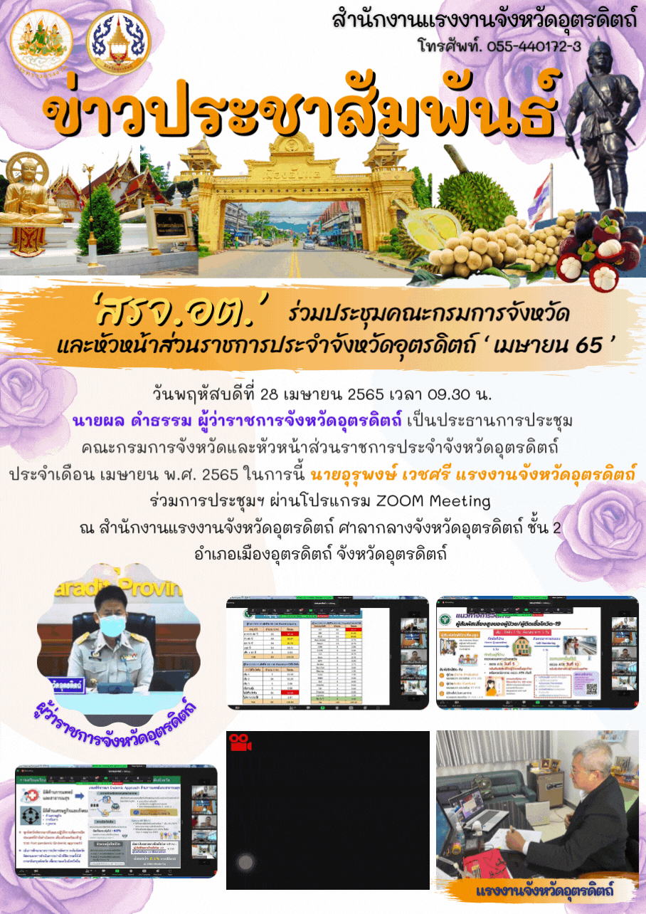 วันพฤหัสบดีที่ 28 เมษายน 2565 เวลา 09.30 น. นายผล ดำธรรม ผู้ว่าราชการจังหวัดอุตรดิตถ์ เป็นประธานการประชุมคณะกรมการจังหวัดและหัวหน้าส่วนราชการประจำจังหวัดอุตรดิตถ์ ประจำเดือน เมษายน พ.ศ. 2565 ในการนี้ นายอุรุพงษ์ เวชศรี แรงงานจังหวัดอุตรดิตถ์ ร่วมการประชุมฯ ผ่านโปรแกรม ZOOM Meeting ณ สำนักงานแรงงานจังหวัดอุตรดิตถ์ ศาลากลางจังหวัดอุตรดิตถ์ ชั้น 2 อำเภอเมืองอุตรดิตถ์ จังหวัดอุตรดิตถ์