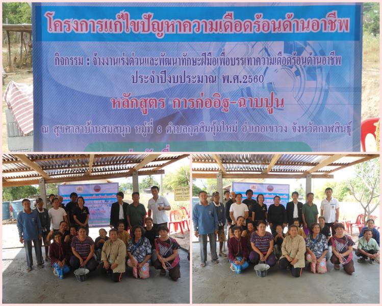 สำนักงานแรงงานจังหวัดกาฬสินธุ์ จัดกิจกรรมจ้างงานเร่งด่วนและพัฒนาทักษะฝีมือเพื่อบรรเทาความเดือดร้อนด้านอาชีพ ตามโครงการแก้ไขปัญหาความเดือดร้อนด้านอาชีพประจำปีงบประมาณ พ.ศ. 2560 หลักสูตร “การก่ออิฐ-ฉาบปูน” ดำเนินการระหว่างวันที่ 10 – 17 มกราคม 2560 ณ สุขศาลาบ้านสมสนุก หมู่ที่ 8 ต.กุดสิมคุ้มใหม่ อ.เขาวง จ.กาฬสินธุ์