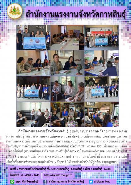 สรจ.กาฬสินธุ์ ตรวจเยี่ยมสถานประกอบกิจการตามแผนการตรวจบูรณาการเพื่อขับเคลื่อนการป้องกันปัญหาการค้ามนุษย์ด้านแรงงาน
