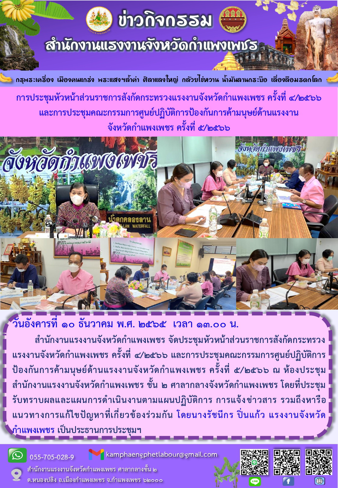 การประชุมหัวหน้าส่วนราชการสังกัดกระทรวงแรงงานจังหวัดกำแพงเพชร และการประชุมคณะกรรมการศูนย์ปฏิบัติการป้องกันการค้ามนุษย์ด้านแรงงาน ประจำเดือนเมษายน 2569