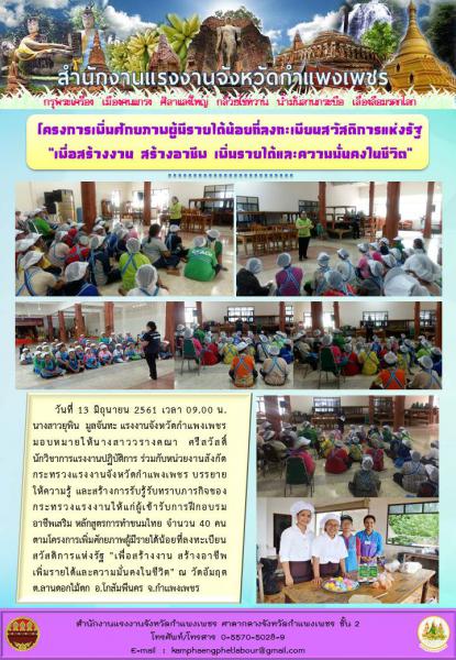 สรจ.กำแพงเพชร ร่วมบรรยายให้ความรู้ และสร้างการรับรู้รับทราบภารกิจของกระทรวงแรงงานให้แก่ผู้เข้ารับการฝึกอบรมตามโครงการเพิ่มศักยภาพผู้มีรายได้น้อยที่ลงทะเบียนสวัสดิการแห่งรัฐ
