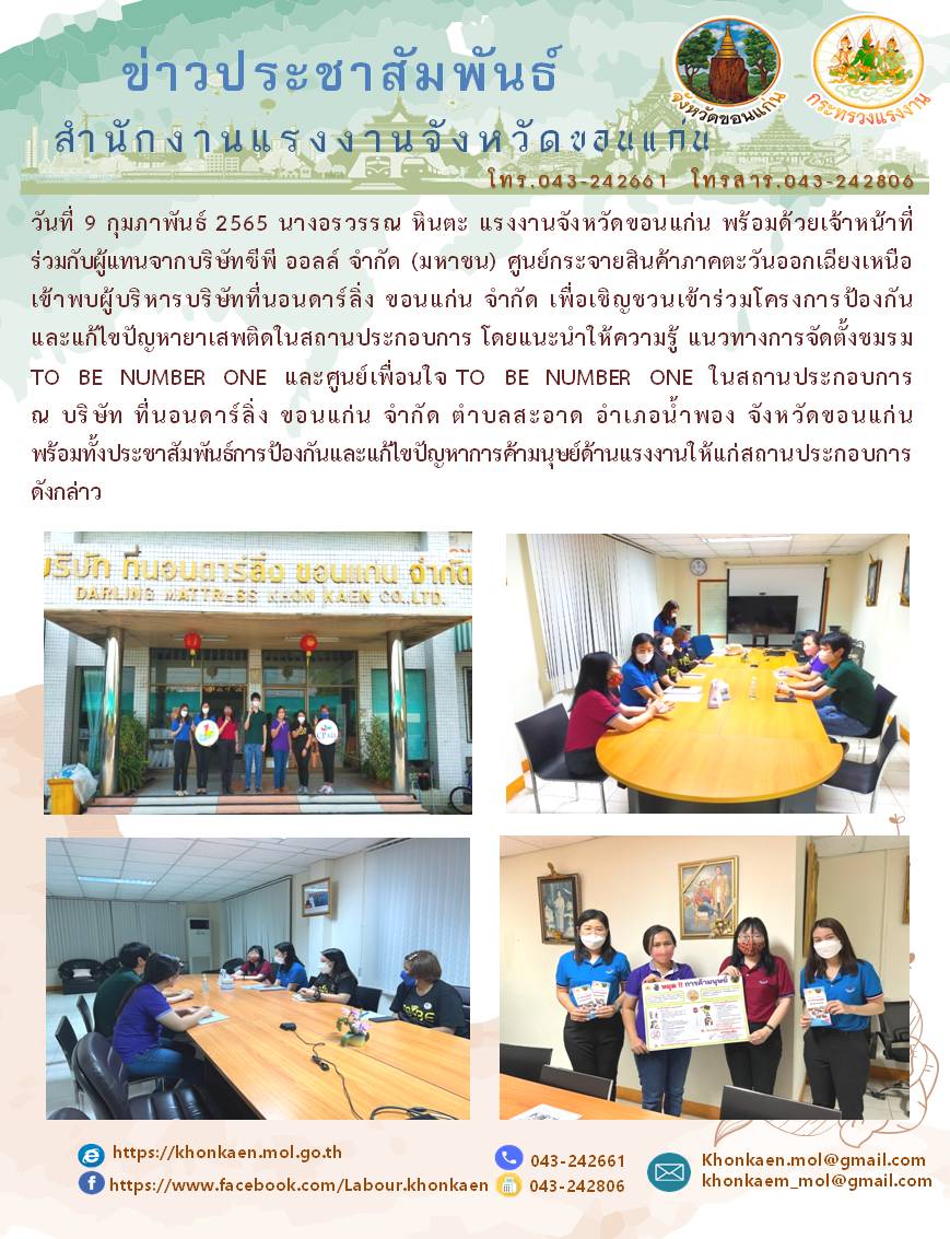 สรจ.ขก ร่วมกับผู้แทนจากบริษัทซีพี ออลล์ จำกัด (มหาชน) เชิญชวนผู้บริหารบริษัทที่นอนดาร์ลิ่ง ขอนแก่น จำกัด เข้าร่วมโครงการป้องกันและแก้ไขปัญหายาเสพติดในสถานประกอบการและแนวทางการจัดตั้งชมรม TO BE NUMBER ONE