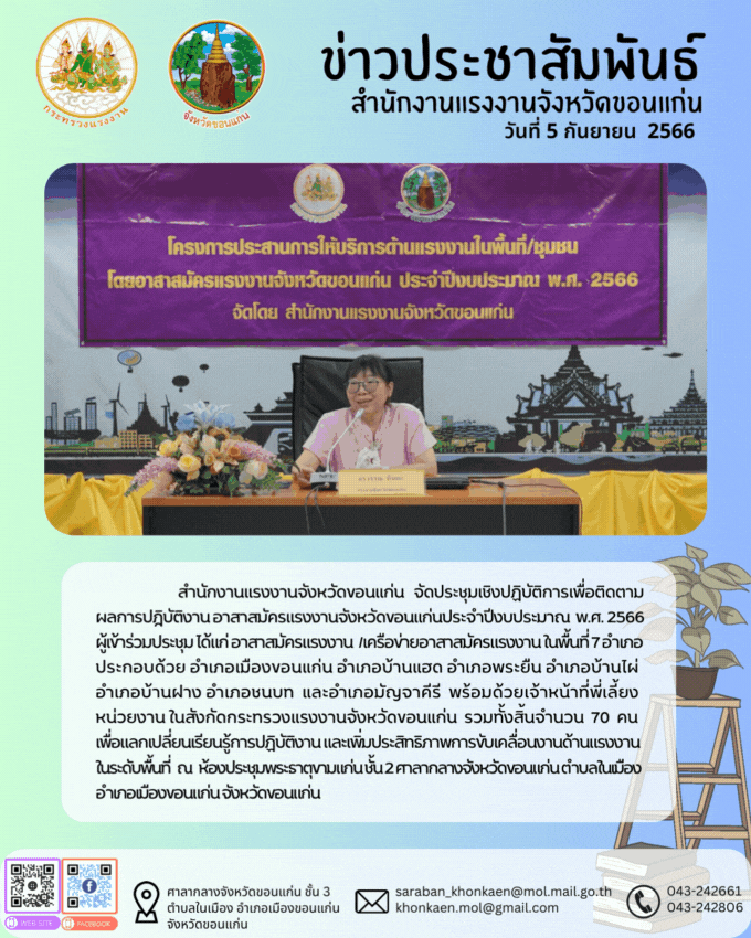 สรจ.ขอนแก่น จัดประชุมเชิงปฏิบัติการเพื่อติดตามผลการปฏิบัติงานอาสาสมัครแรงงานจังหวัดขอนแก่น ประจำปีงบประมาณ พ.ศ.2566