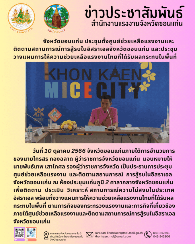 สรจ.ขอนแก่น ร่วมประชุมจัดตั้งศูนย์ช่วยเหลือแรงงานและติตตามสถานการณ์การสู้รบในอิสราเอลจังหวัดขอนแก่น