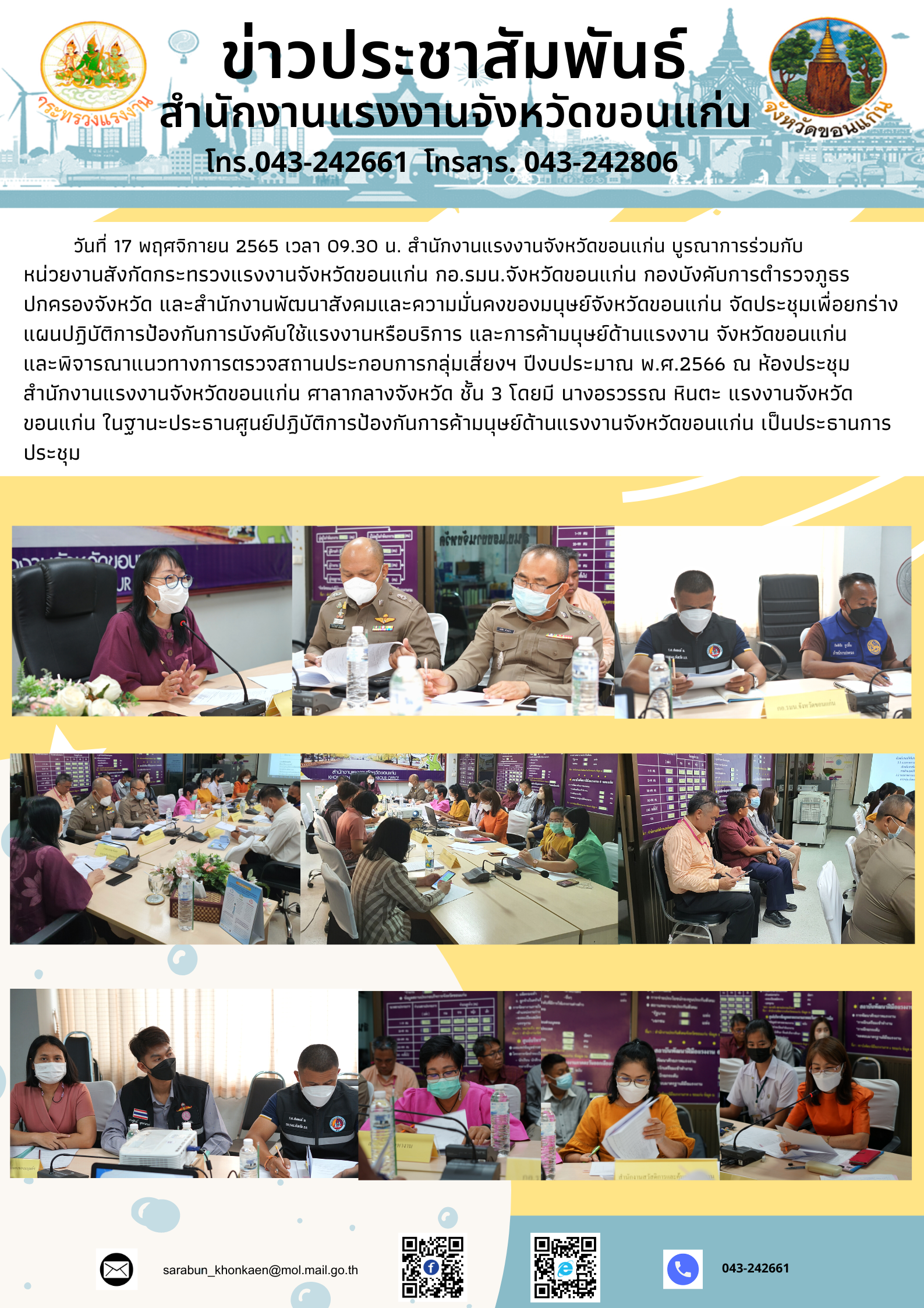 สรจ.ขอนแก่นประชุมเพื่อยกร่างแผนปฎิบัติการป้องกันการบังคับใช้แรงงานหรือบริการ และการค้ามนุษย์ด้านแรงงาน จังหวัดขอนแก่น และพิจารณาแนวทางการตรวจสถานประกอบการกลุ่มเสี่ยงฯ ปีงบประมาณ พ.ศ.2566