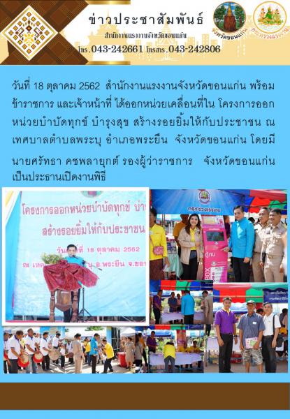 สรจ.ขอนแก่น ร่วมออกหน่วยเคลื่อนที่ให้บริการด้านแรงงานตามโครงการหน่วยบำบัดทุกข์บำรุงสุข สร้างรอยยิ้มให้กับประชาชน และหน่วยแพทย์เคลื่อนที่ พอ.สว.