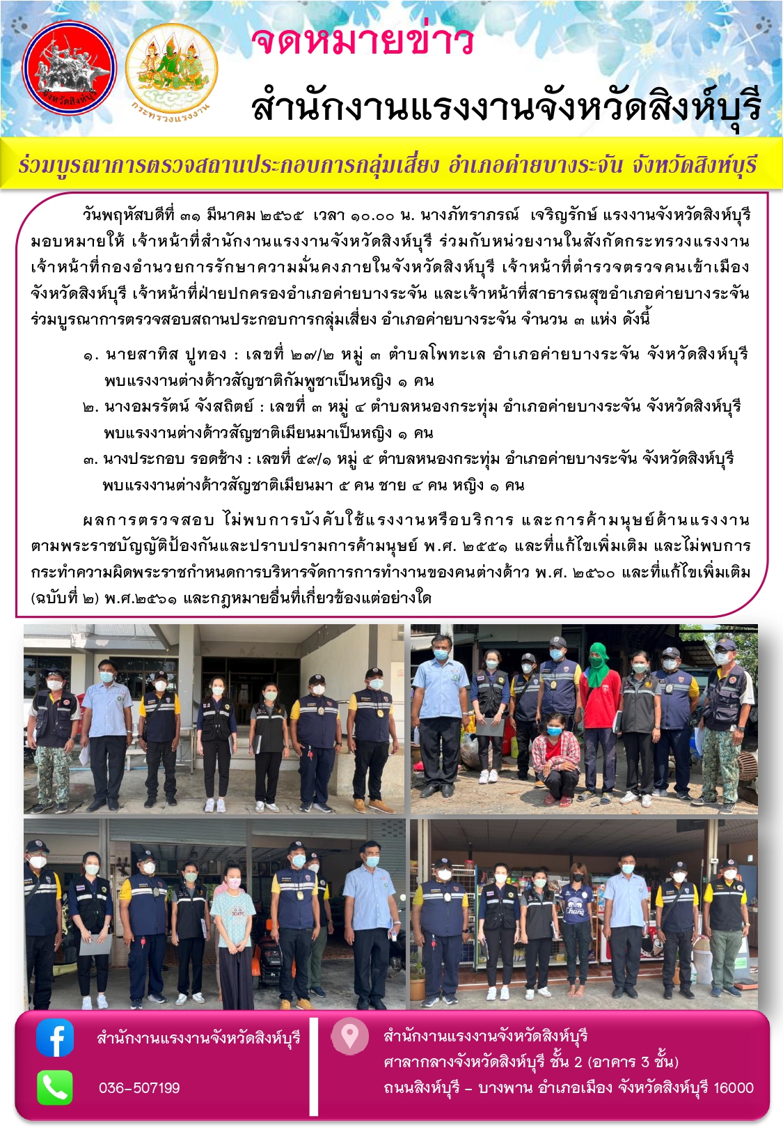 สรจ.จังหวัดสิงห์บุรีร่วมบูรณาการตรวจสถานประกอบการกลุ่มเสี่ยง อำเภอค่ายบางระจัน จังหวัดสิงห์บุรี