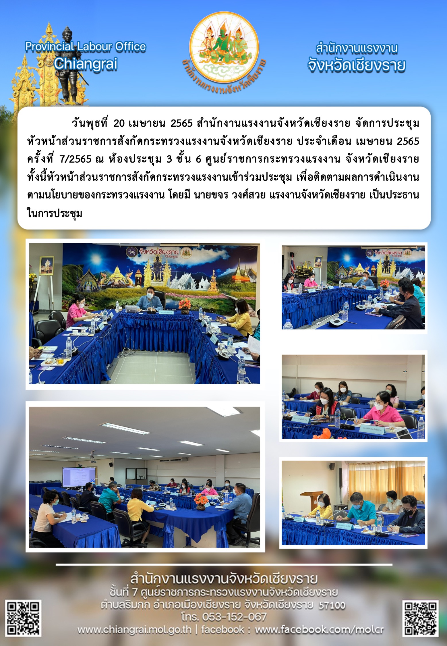 สรจ.ชร จัดการประชุมหัวหน้าส่วนราชการสังกัดกระทรวงแรงงานจังหวัดเชียงราย ประจำเดือน เมษายน 2565 ครั้งที่ 7/2565