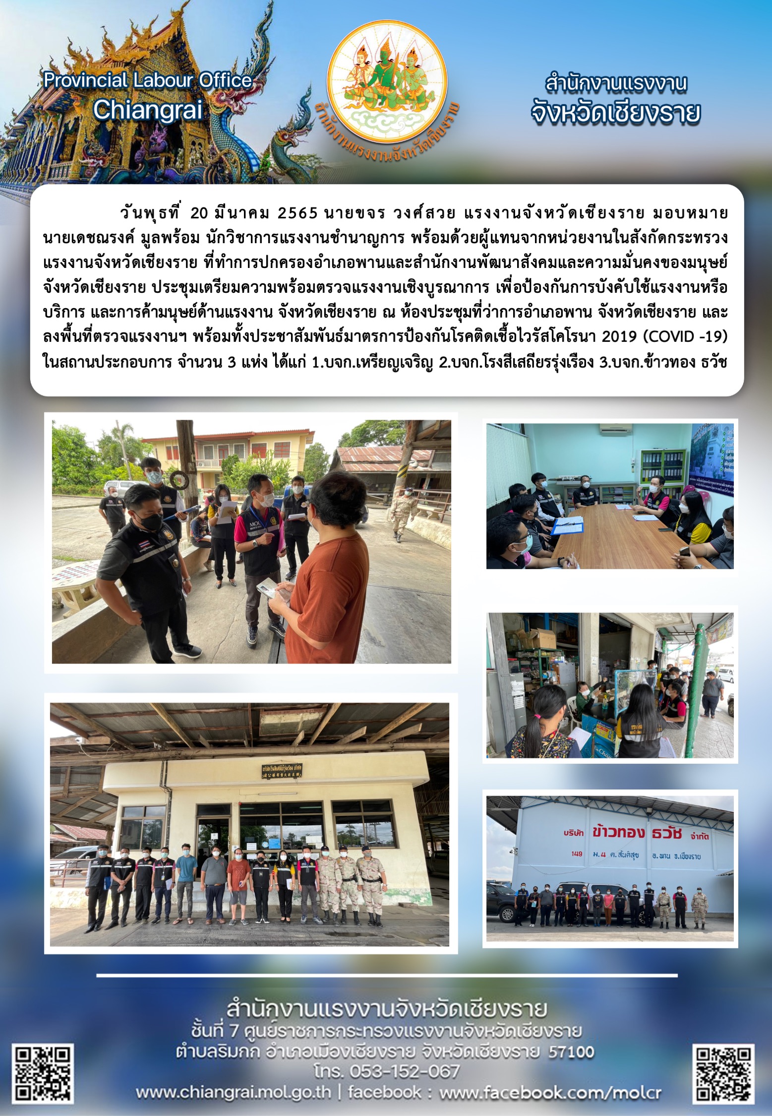 สรจ.ชร พร้อมด้วยผู้แทนหน่วยงานในสังกัดกระทรวงแรงงานจังหวัดเชียงราย พมจ.ชร และที่ทำการปกครองอำเภอพานประชุมเตรียมความพร้อมแรงงานเชิงบูรณาการ เพื่อป้องกันการบังคับใช้แรงงานหรือบริการ และการค้ามนุษย์ด้านแรงงาน และลงพื้นที่ตรวจแรงงานฯ