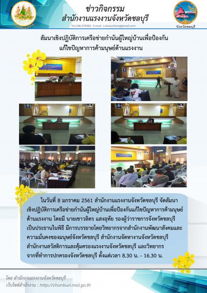 สรจ.ชลบุรี จัดสัมนาเชิงปฏิบัติการเครือข่ายกำนันผู้ใหญ่บ้านเพื่อป้องกันแก้ไขปัญหาค้ามนุษย์ด้านแรงงาน