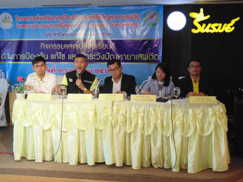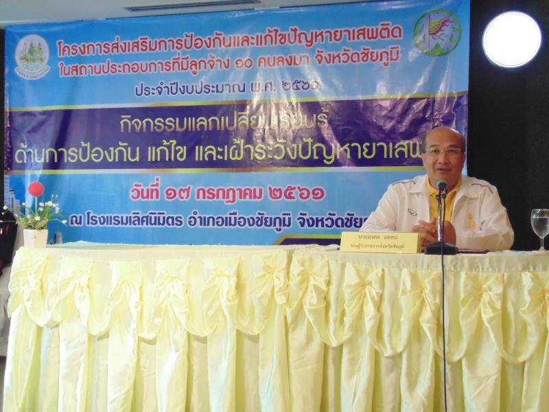 วันนี้สำนักงานแรงงานจังหวัดชัยภูมิหน่วยงานในสังกัดกระทรวงแรงงานจังหวัดชัยภูมินำโดย ท่านแรงงานจังหวัดนางสาวอิสรี วีรกุลพิพัฒน์ จัดโครงการอบรมส่งเสริมการป้องกันและแก้ไขปัญหายาเสพติดในสถาน ประกอบการที่มีลูกจ้าง 10 คนลงมา ประจำปีงบประมาณ พ.ศ. 2561 ซึ่งท่านรองผู้ว่าราชการจังหวัดชัยภูมิ นายมงคล อดทน ให้เกียรติ เป็นประธานในพิธีเปิด ณ โรงแรม เลิศนิมิตร อ.เมือง จ. ชัยภูมิ