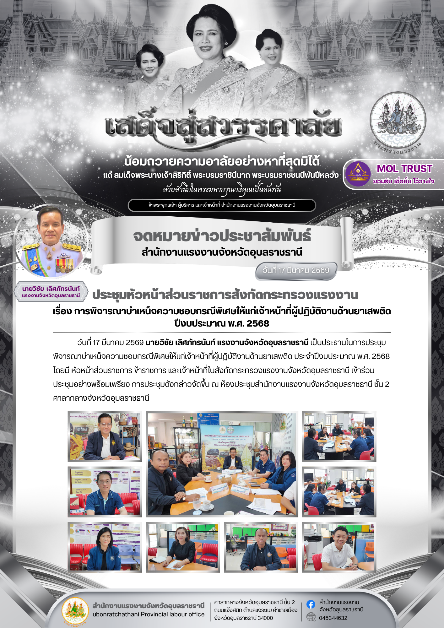 แรงงานจังหวัดอุบลราชธานี เป็นประธานในการประชุมพิจารณาบำเหน็จความชอบกรณีพิเศษให้แก่เจ้าหน้าที่ผู้ปฏิบัติงานด้านยาเสพติด ประจำปีงบประมาณ พ.ศ. 2568