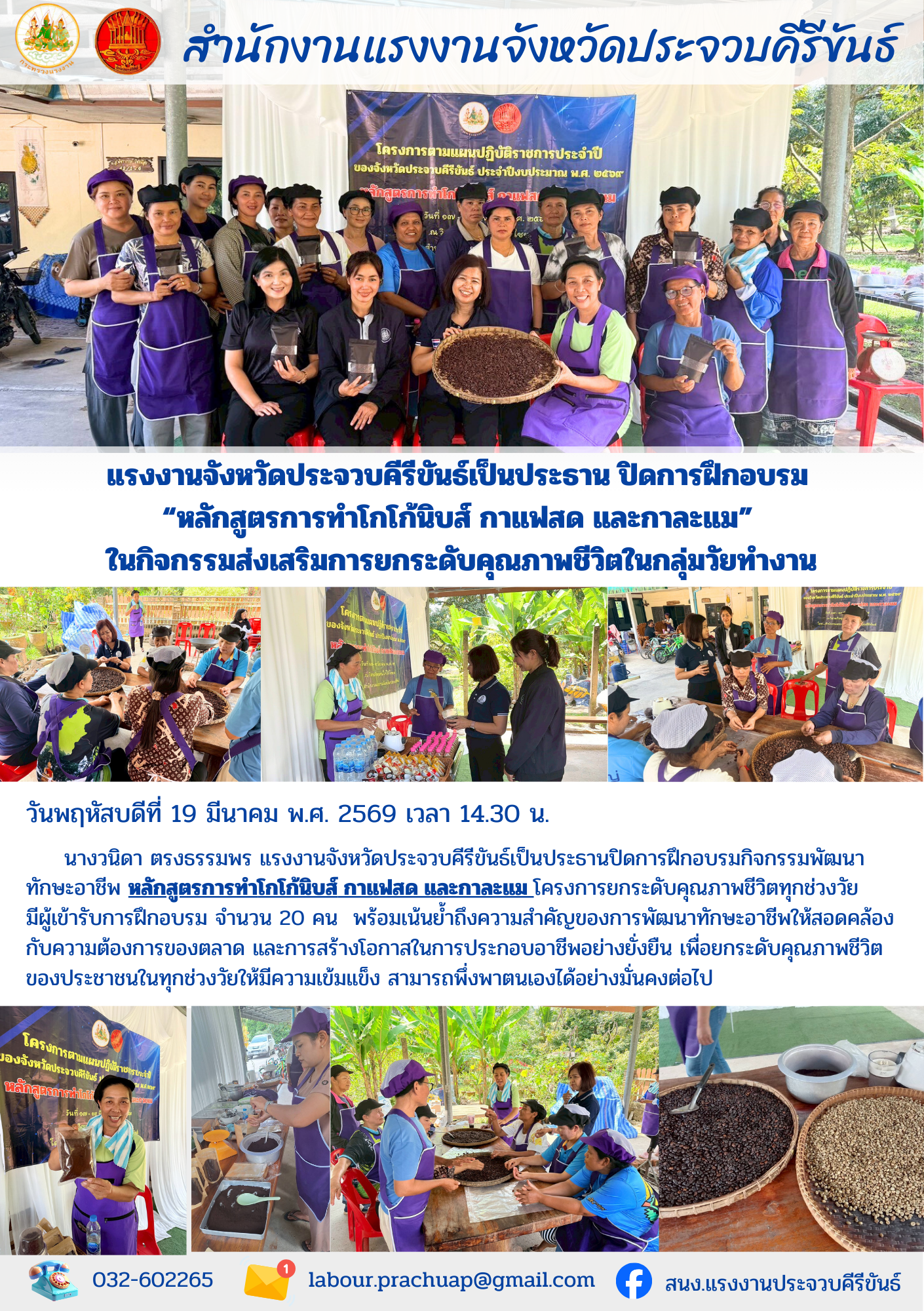 แรงงานจังหวัดประจวบคีรีขันธ์เป็นประธาน ปิดการฝึกอบรม “หลักสูตรการทำโกโก้นิบส์ กาแฟสด และกาละแม” ในกิจกรรมส่งเสริมการยกระดับคุณภาพชีวิตในกลุ่มวัยทำงาน