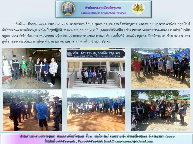 สรจ.ชุมพร ร่วมชุดปฏิบัติการตรวจสอบ ปราบปราม จับกุมและดำเนินคดีนายจ้าง/สถานประกอบการและแรงงานต่างด้าวผิดกฎหมาย