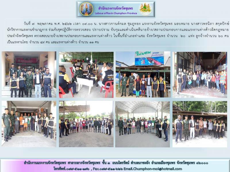สรจ.ชุมพร ร่วมชุดปฏิบัติการตรวจสอบ ปราบปราม จับกุมและดำเนินคดีนายจ้าง/สถานประกอบการและแรงงานต่างด้าวผิดกฎหมาย