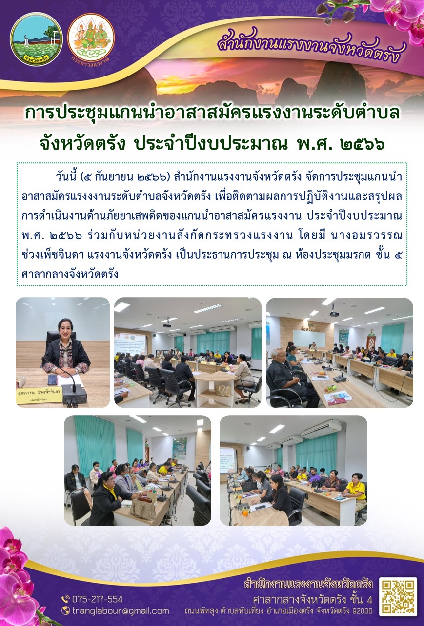 สรจ.ตรัง จัดการประชุมแกนนำอาสาสมัครแรงงงานระดับตำบลจังหวัดตรัง เพื่อติดตามผลการปฏิบัติงานและสรุปผลการดำเนินงานต้านภัยยาเสพติดของแกนนำอาสาสมัครแรงงาน ประจำปีงบประมาณ พ.ศ.2566