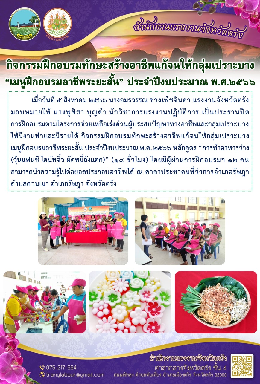 สรจ.ตรัง ปิดการฝึกอบรมตามโครงการช่วยเหลือเร่งด่วนผู้ประสบปัญหาทางอาชีพและกลุ่มเปราะบางให้มีงานทำและมีรายได้ กิจกรรมฝึกอบรมทักษะสร้างอาชีพแก้จนให้กลุ่มเปราะบาง เมนูฝึกอบรมอาชีพระยะสั้น ประจำปีงบประมาณ พ.ศ.2566 หลักสูตร “การทำอาหารว่าง (วุ้นแฟนซี โดนัทจิ๋ว ผัดหมี่ถังแตก)” (18 ชั่วโมง)