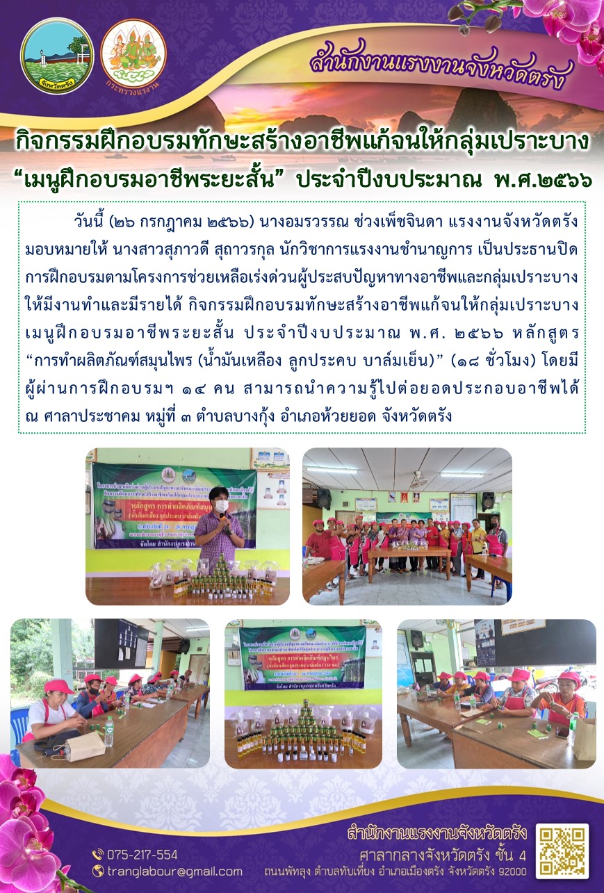 สรจ.ตรัง ปิดการฝึกอบรมตามโครงการช่วยเหลือเร่งด่วนผู้ประสบปัญหาทางอาชีพและกลุ่มเปราะบางให้มีงานทำและมีรายได้ ประจำปีงบประมาณ พ.ศ.2566 หลักสูตร “การทำผลิตภัณฑ์สมุนไพร (น้ำมันเหลือง ลูกประคบ บาล์มเย็น)” (18 ชั่วโมง)