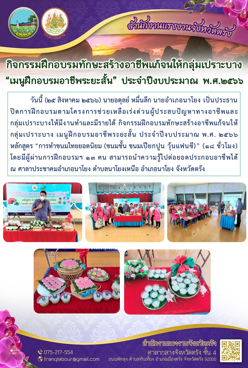 สรจ.ตรัง ปิดการฝึกอบรมตามโครงการช่วยเหลือเร่งด่วนผู้ประสบปัญหาทางอาชีพและกลุ่มเปราะบางให้มีงานทำและมีรายได้ กิจกรรมฝึกอบรมทักษะสร้างอาชีพแก้จนให้กลุ่มเปราะบาง เมนูฝึกอบรมอาชีพระยะสั้น ประจำปีงบประมาณ พ.ศ. 2566 หลักสูตร “การทำขนมไทยยอดนิยม (ขนมชั้น ขนมเปียกปูน วุ้นแฟนซี)” (18 ชั่วโมง)