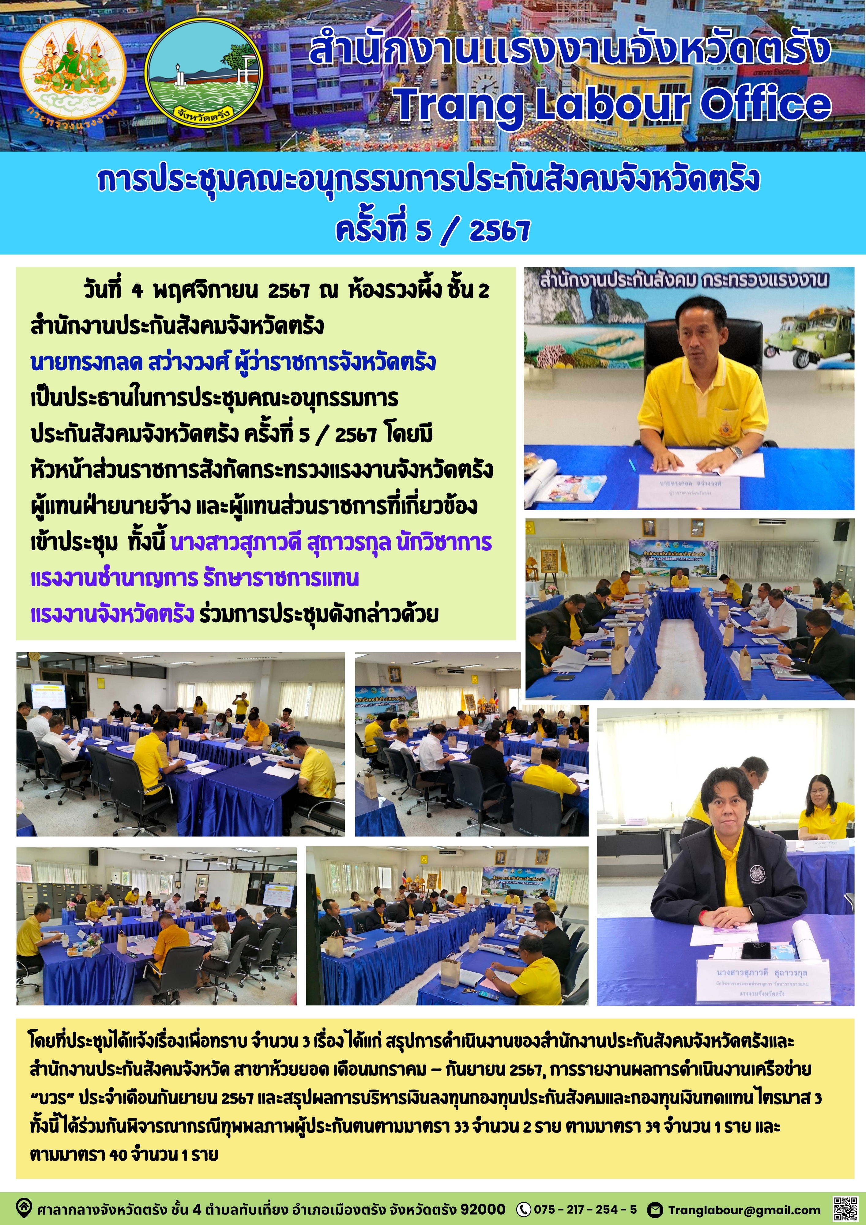 สรจ.ตรัง ร่วมการประชุมคณะอนุกรรมการประกันสังคมจังหวัดตรัง ครั้งที่ 5/2567