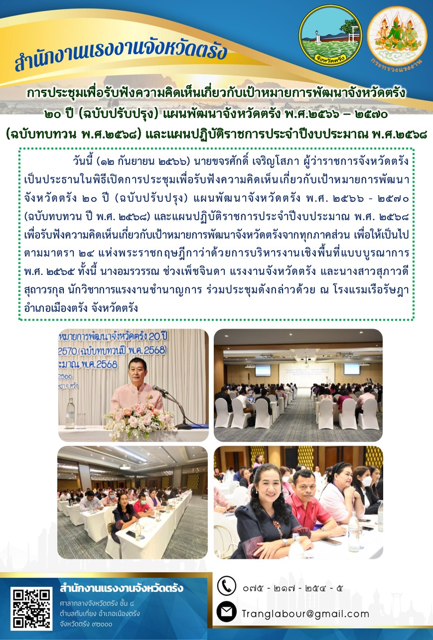สรจ.ตรัง ร่วมการประชุมเพื่อรับฟังความคิดเห็นเกี่ยวกับเป้าหมายการพัฒนาจังหวัดตรัง 20 ปี (ฉบับปรับปรุง) แผนพัฒนาจังหวัดตรัง พ.ศ.2566 – 2570 (ฉบับทบทวน ปี พ.ศ. 2568) และแผนปฏิบัติราชการประจำปีงบประมาณ พ.ศ.2568